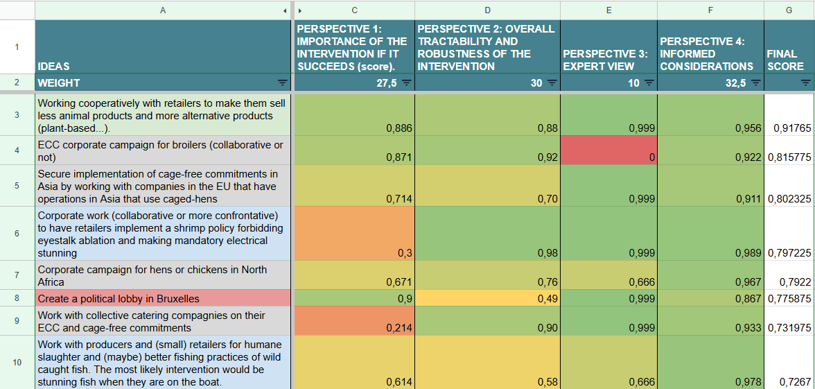 The first step was to generate a large number of intervention ideas, without limiting ourselves to ‘obvious’ or ‘easy’ ones. We talked with dozens of experts and activists, read research reports, and tried to think on our own about what could be done to help animals. At this stage, we came up with a total of 94 ideas.