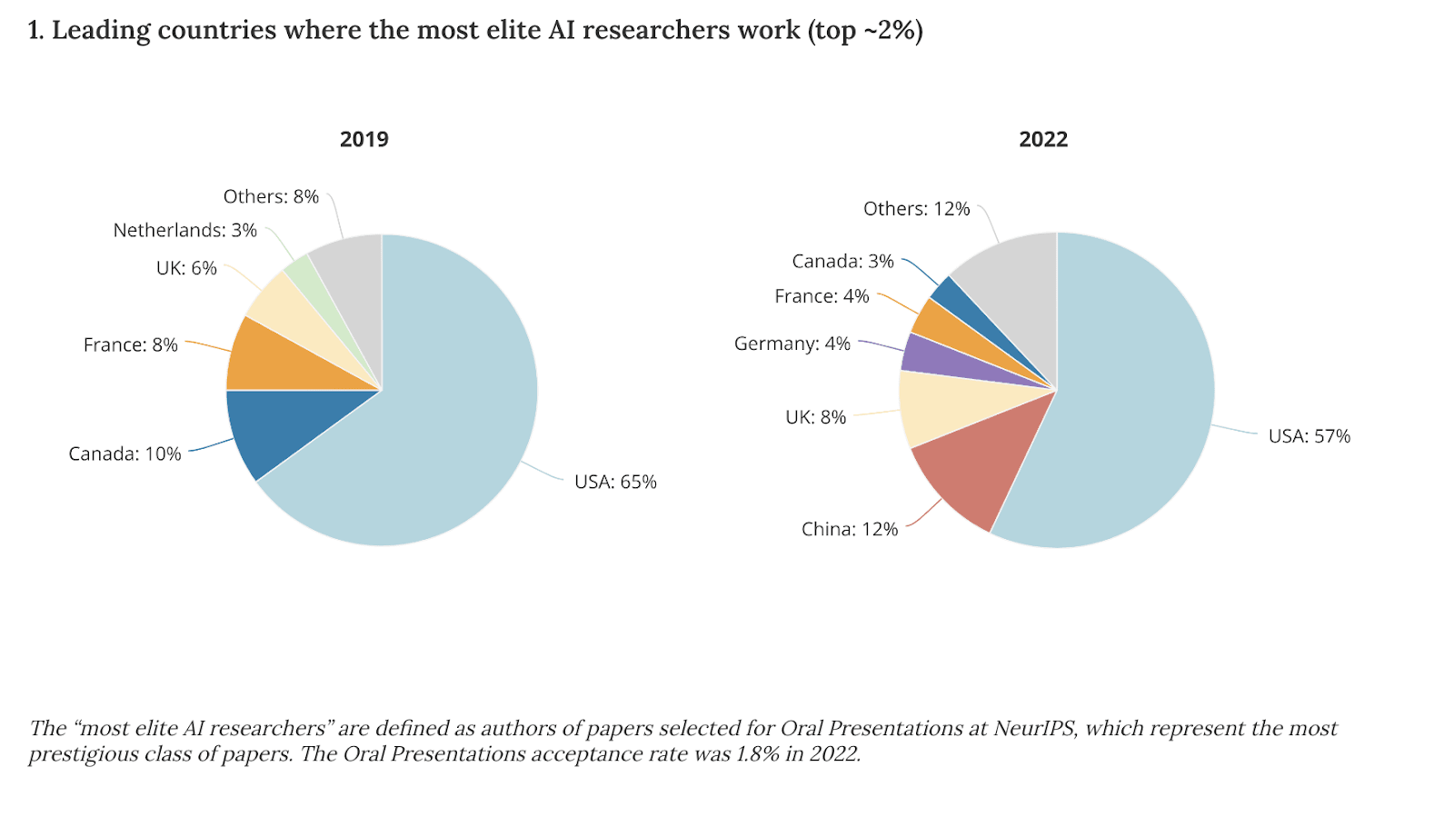 Talent is an essential ingredient for any AI industry, and there are signs that talent available to the Chinese AI industry is rapidly growing. Although China lags the US in innovative AI research, there are signs that Chinese talent is growing. In 2019 China was not even on the board in NeurIPS. In 2022 they had 12% of the papers. More generally, the Chinese AI sector is booming and although it is not at the level of competitiveness of the US, and despite severe restrictions on compute by the US, China manages to release generalist LLM and multi-modal models not too far behind the frontier set by the US. Drawing more talent away from China has the potential to concentrate frontier AI research in the United States, slowing AI development in China relative to the United States, complementing the compute limit set by the BIS in 2022 with a “talent limit” or at least a “talent headwind”. Even if security concerns prevent workers from China from directly working in frontier work, they may work in adjacent sectors, freeing up US AI workers to focus on cutting-edge frontier AI.