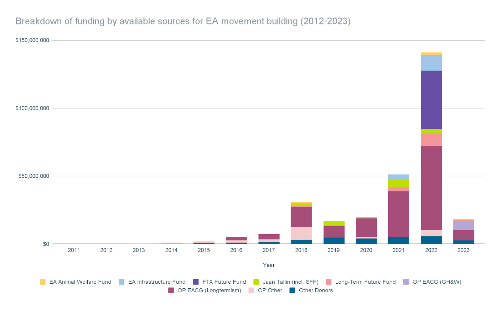 - Individual donors: I estimate that $1-20M since 2012 is probably still missing, since I haven’t included donors who work with Effective Giving, Generation Pledge or Founders’ Pledge.