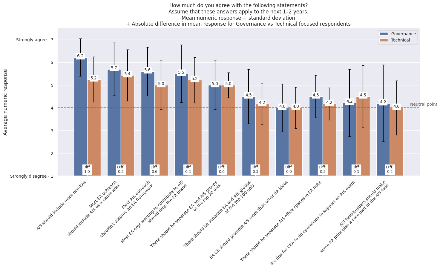 - Disagreements in overlap between EA and AIS infrastructure: Respondents were uncertain whether there should be separate AI safety office spaces in EA hubs and whether there should be separate EA and AI safety student groups at the top 100 universities, but a majority agreed that there should be separate EA and AI safety student groups at the top 20 universities.