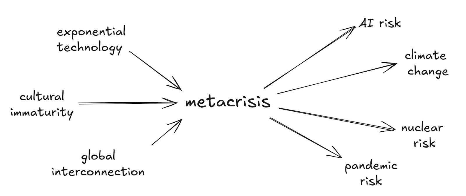 Executive summary: Through a fictional yet philosophically rich dialogue, the post explores the idea that existential risks like AI doom are not just technical challenges but symptoms of a deeper “metacrisis”—a mismatch between the accelerating power of our technologies and the immaturity of our cultural and societal systems—arguing that the Effective Altruism movement should include this systems-level lens in its epistemic toolkit, even if the path forward is speculative and the tractability uncertain.