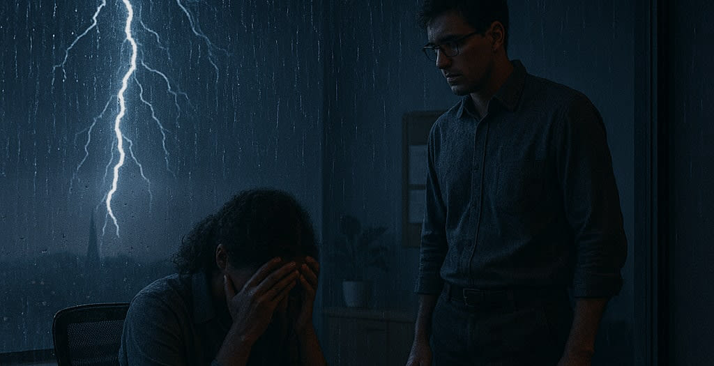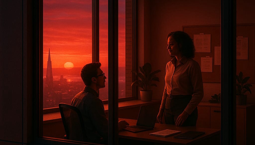 In her office nestled in the corner of constellation, Amina is checking in with her employee Diego about his project – a new AI alignment technique. It’s 8pm and the setting sun is filling Amina’s office with a red glow. Diego is clearly running a sleep deficit, and 60% of Amina's mind is on a paper deadline next week.
