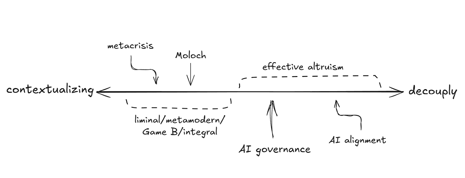 Diego: I see the main way the metacrisis folk are different is that they’re less decouply than EAs. While EAs like to decouple the problem they’re thinking about from its context, metacrisis people are more prone to emphasise the context the problem lives in – be that institutional, societal, cultural or whatever. They’re systems thinkers, they pay more attention to interconnectedness and complexity.