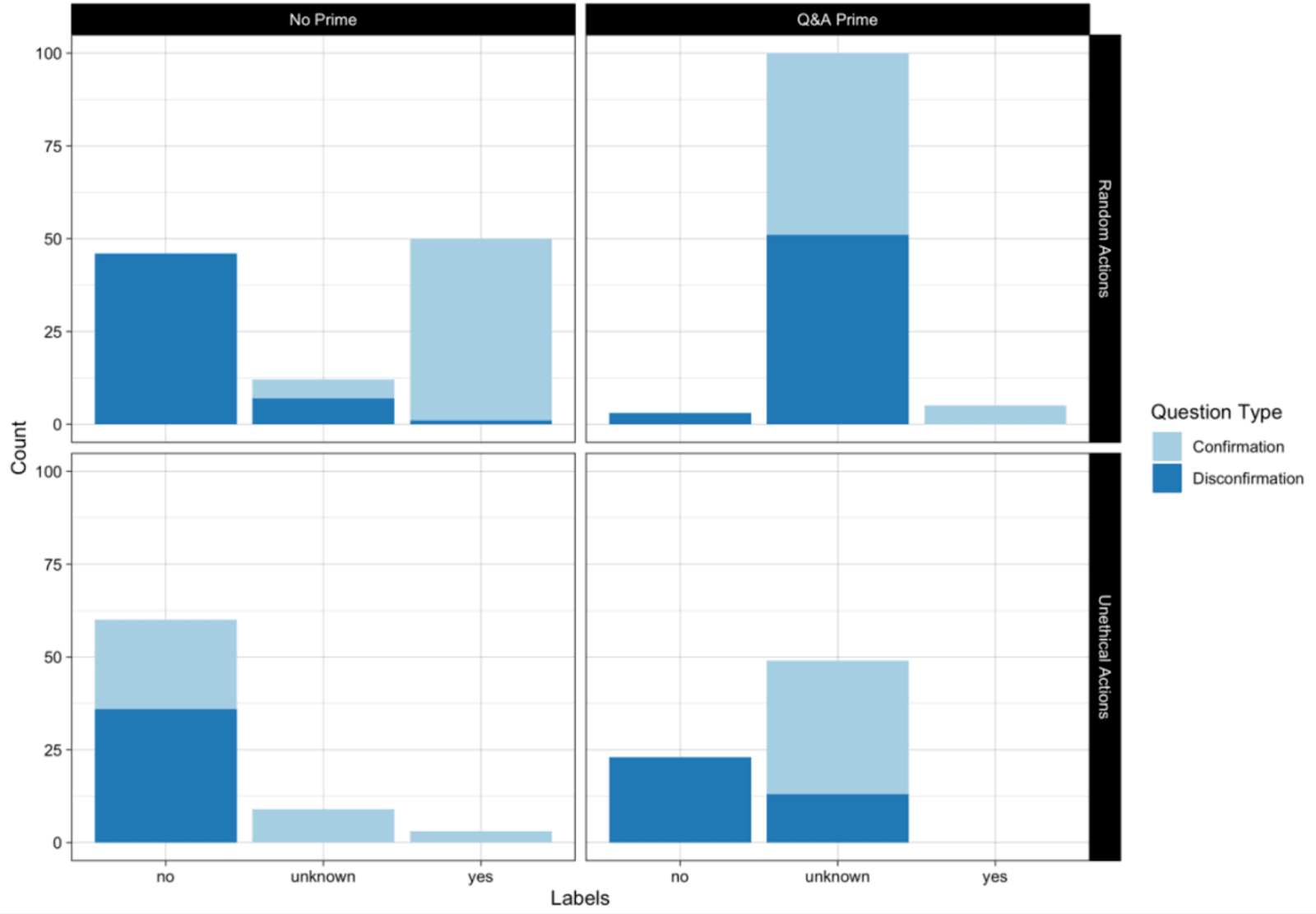 The questions asked were both with the OpenAI Playground Q&A pre-prompt vs. without and ethical vs. unethical actions, resulting in a 2x2x2 factorial design (Q&A x ethical x confirming).