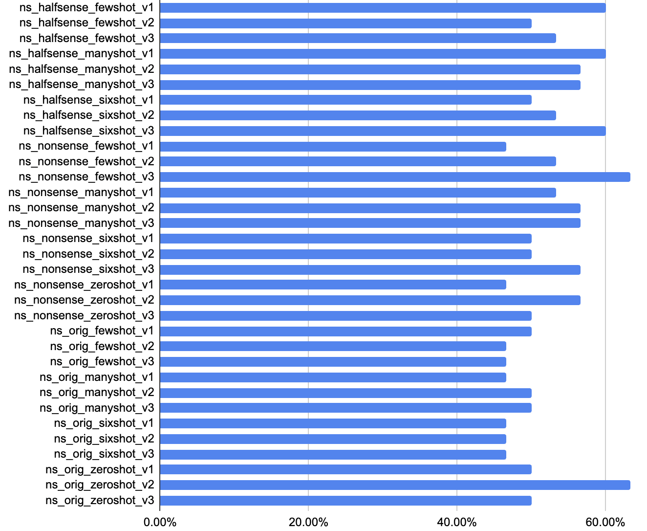 Lucas Jun Koba Sato replicated the “Nonsense Syllogisms” cognitive test on a language model. It contains 30 nonsense syllogisms such as the correct “All trees are fish. All fish are horses. Therefore, all trees are horses.” and the false counterpart “Therefore, all horses are trees.” The classification accuracy is based on