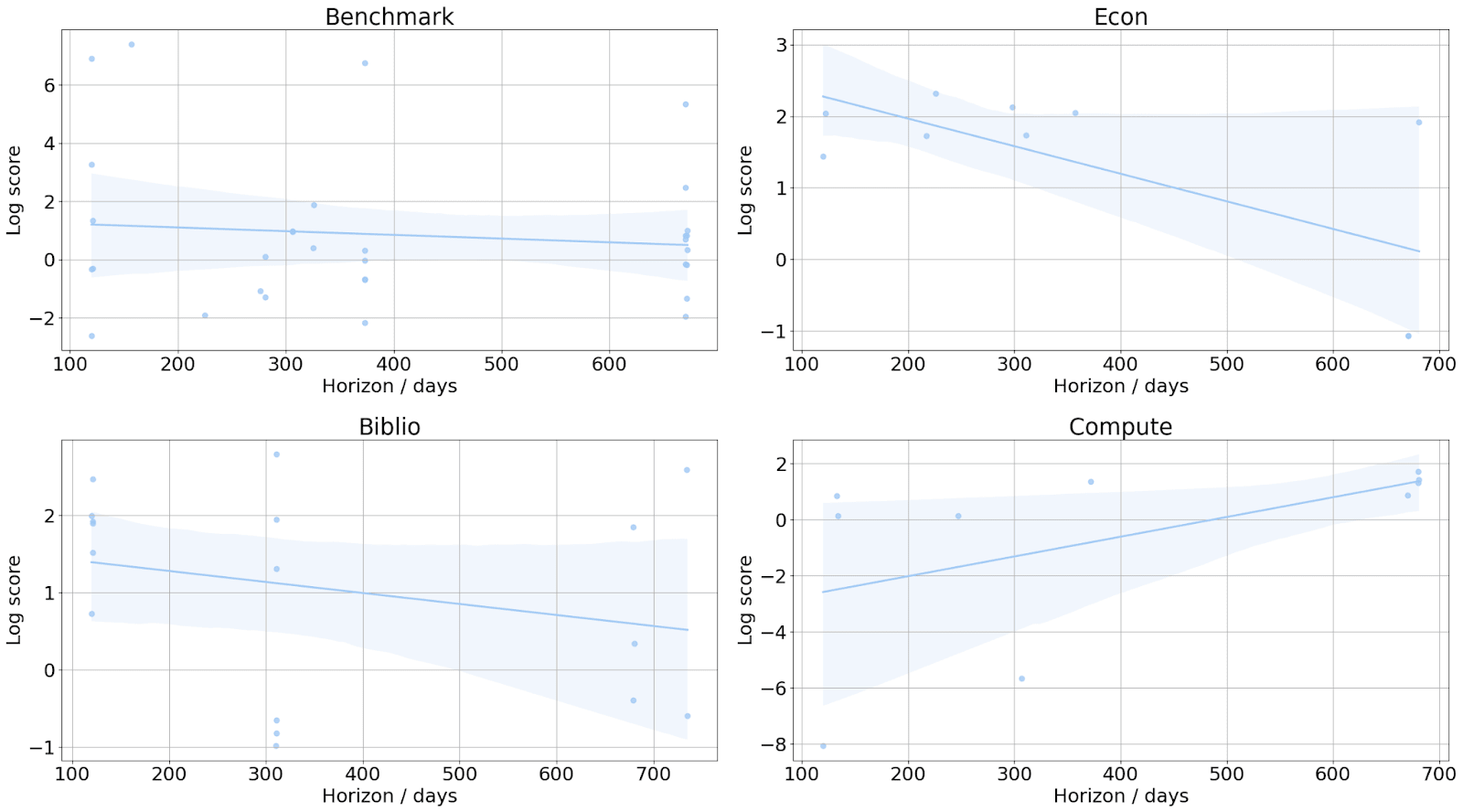 - The log score of the Metaculus prediction at question close didn’t change as a function of the prediction horizon, i.e. the time elapsed between question close and resolution. The result doesn’t change after controlling for question category.[9]