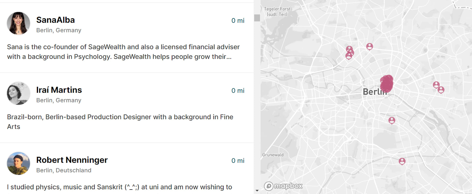 First, we need a way to find out who lives in your neighborhood. I suggest we use the existing EA forum community members map. Here in Berlin, a few people already specified their locations (approximately, for privacy reasons), but most just put in “Berlin” and are displayed in the city center instead.