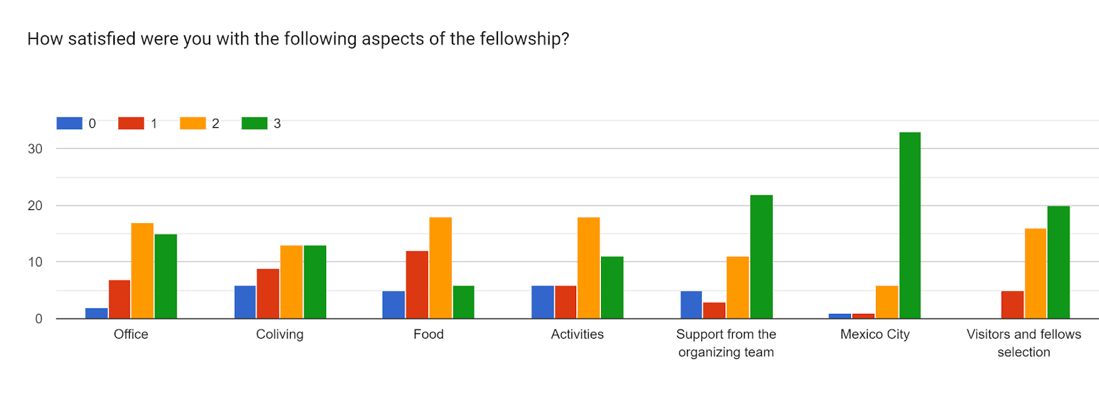 To assess the satisfaction of participants with the fellowship, feedback was collected on seven aspects: the Office Space, the Coliving Space, the Food, the Activities, the support from the organizing team, the selection of Mexico City as the host location, and the selection of fellows and visitors.
