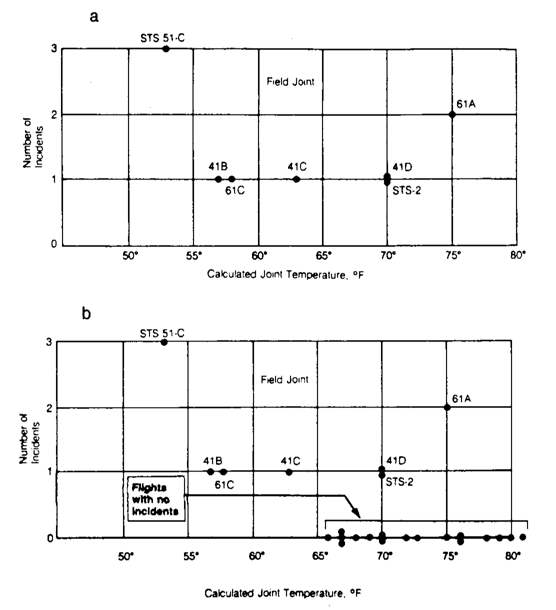 Incidents in O-rings in prior tests versus temperatures. NASA decided to launch Space Shuttle Challenger based on data presented in the top panel, thus omitting data from flights with zero incidents (shown in the bottom panel). Credit: Bookdown
