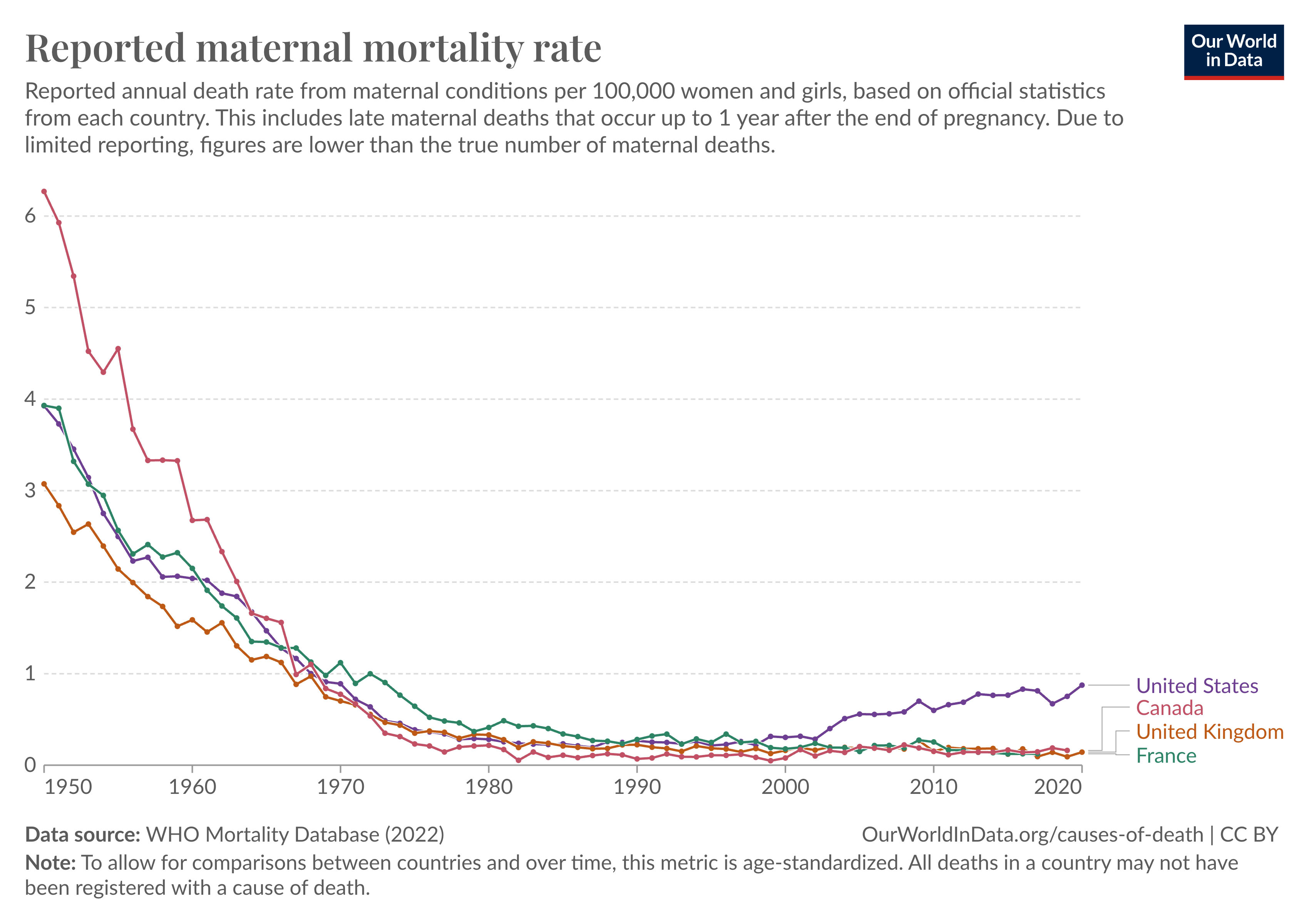 Maternal mortality rates over time, with zoomed version at bottom. Note that the uptick in maternal death rates is limited to the U.S. Credit: Our World in Data