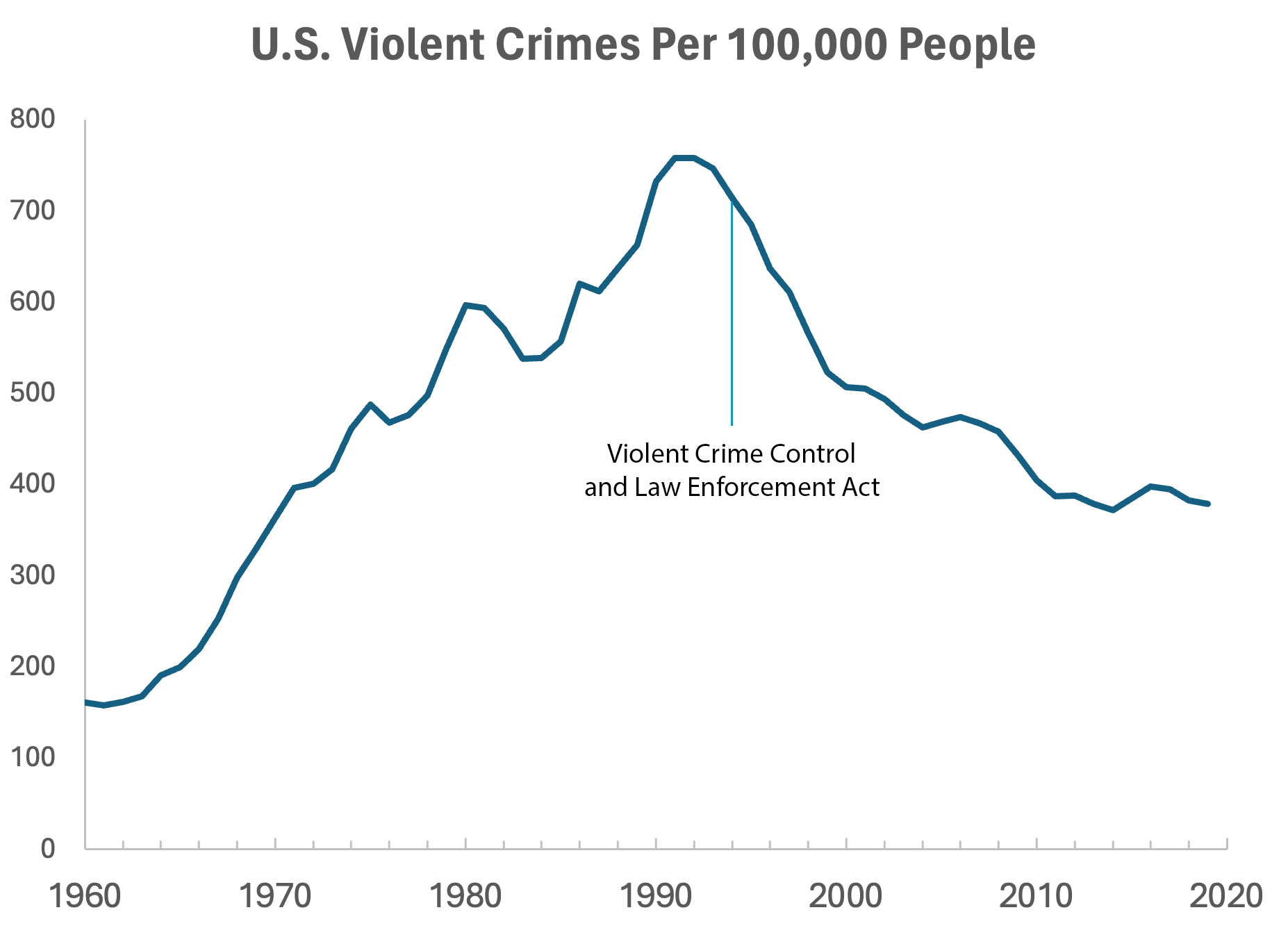 In 1994, the U.S. Congress passed the largest crime bill in U.S. history, called the Violent Crime Control and Law Enforcement Act. The bill allocated billions of dollars to build more prisons and hire 100,000 new police officers, among other things. In the years following the bill’s passage, violent crime rates in the U.S. dropped drastically, from around 750 offenses per 100,000 people in 1990 to under 400 in 2018.