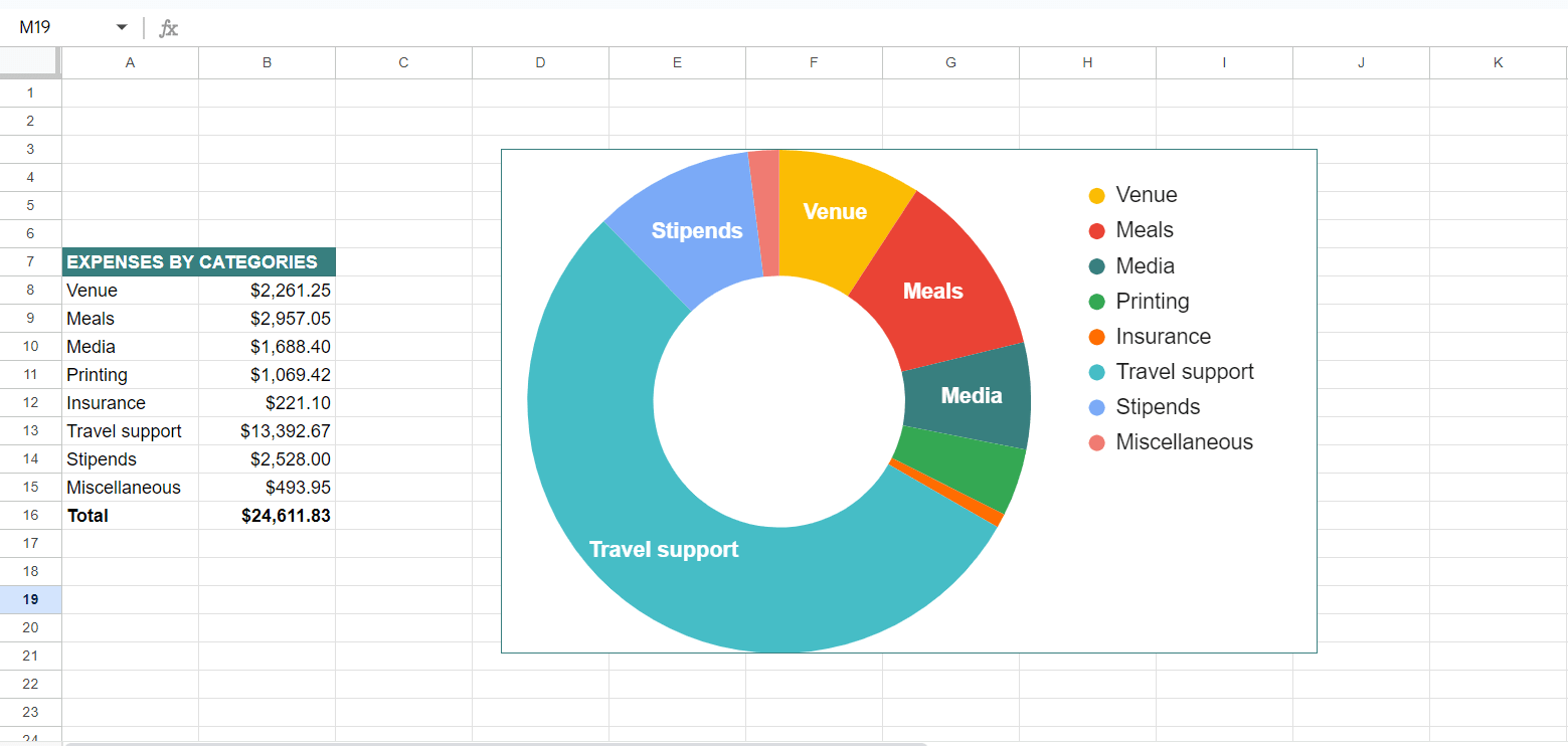 The expenses for the summit fall into 8 categories, namely: Venue, Meals, Media, Printing, Insurance, Travel support, Organisers Stipends and Miscellaneous.