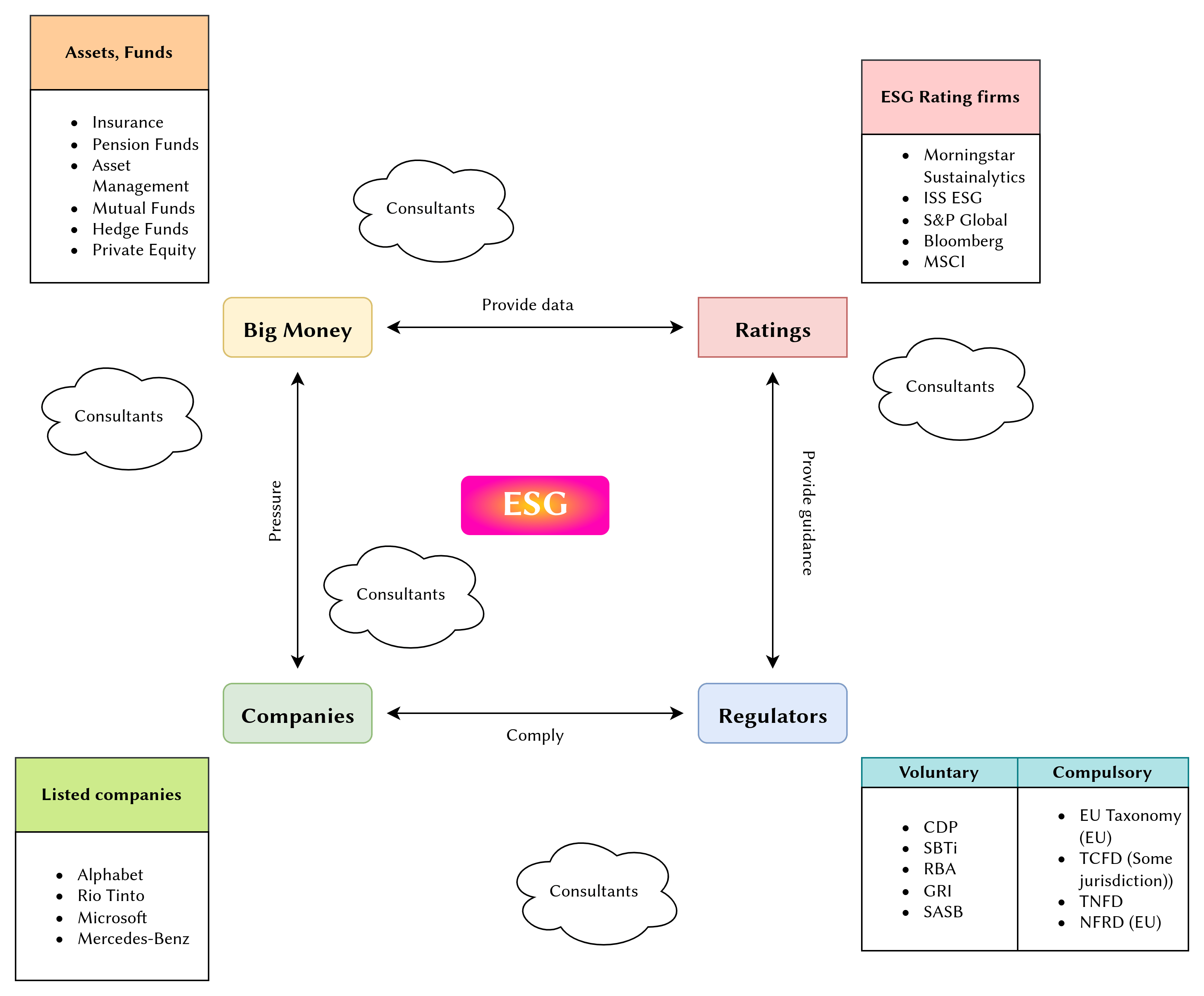 Figure 1. Schematic diagram on how various stakeholders in the ESG finance world relate to each other