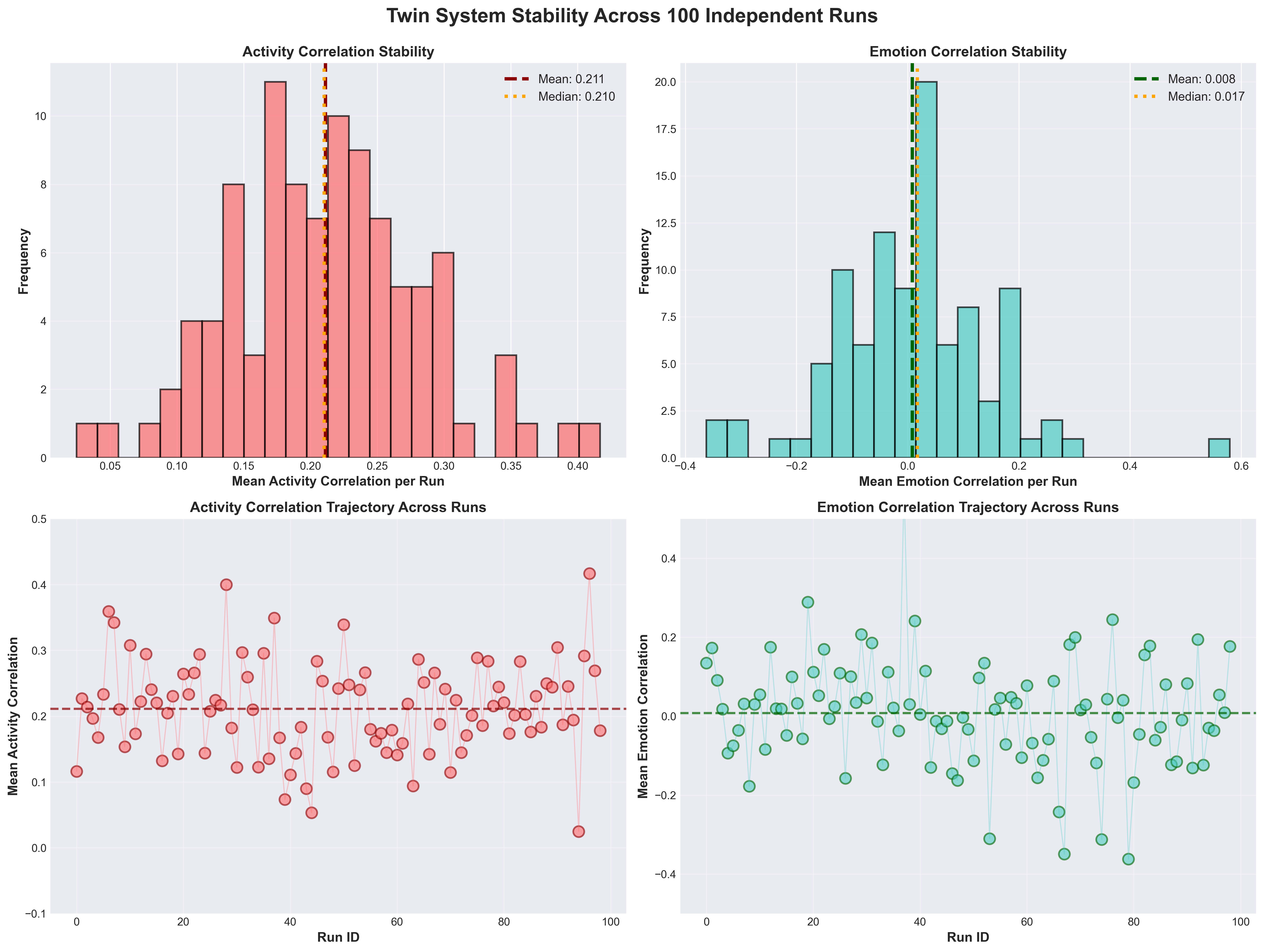 - Twin A: receives tiny HRLS-style nudges (“Principle Cards”) to the cortex→emotion matrix.