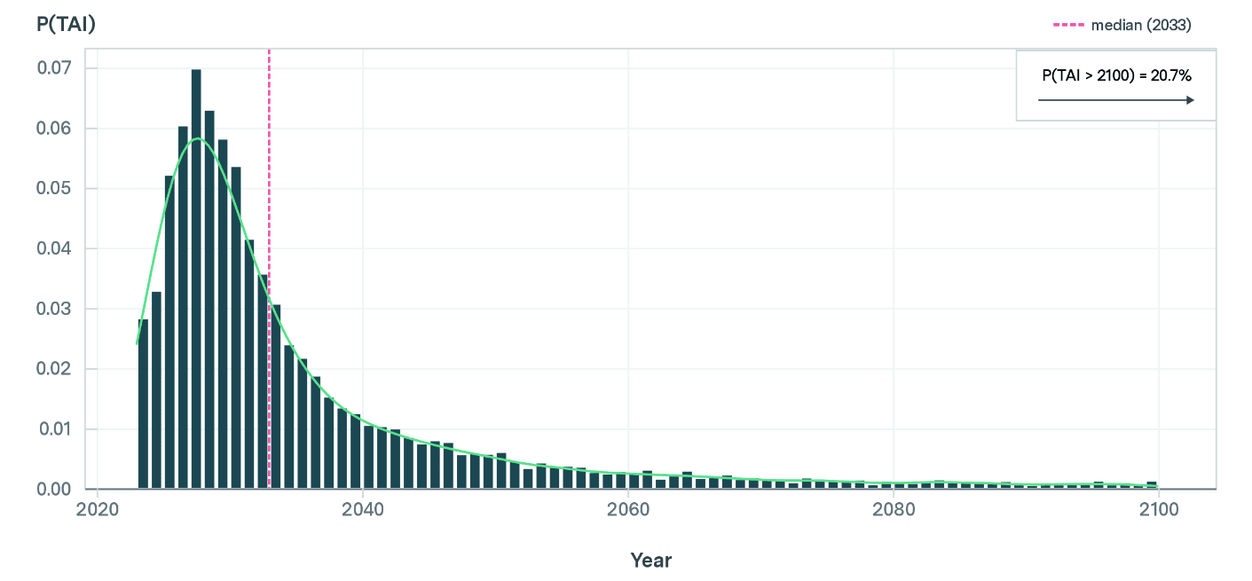 It should be noted that, although Epoch takes an approach to forecasting TAI that is quite different to others in this space, its resulting probability distribution is not vastly dissimilar to those produced by other influential models. Under the current version of the interactive model, its median prediction is just two decades earlier than that from Cotra’s forecast. This adds to a wide pool of recent predictions which suggest that humanity could face transformative AI within the next few decades (and possibly much sooner).