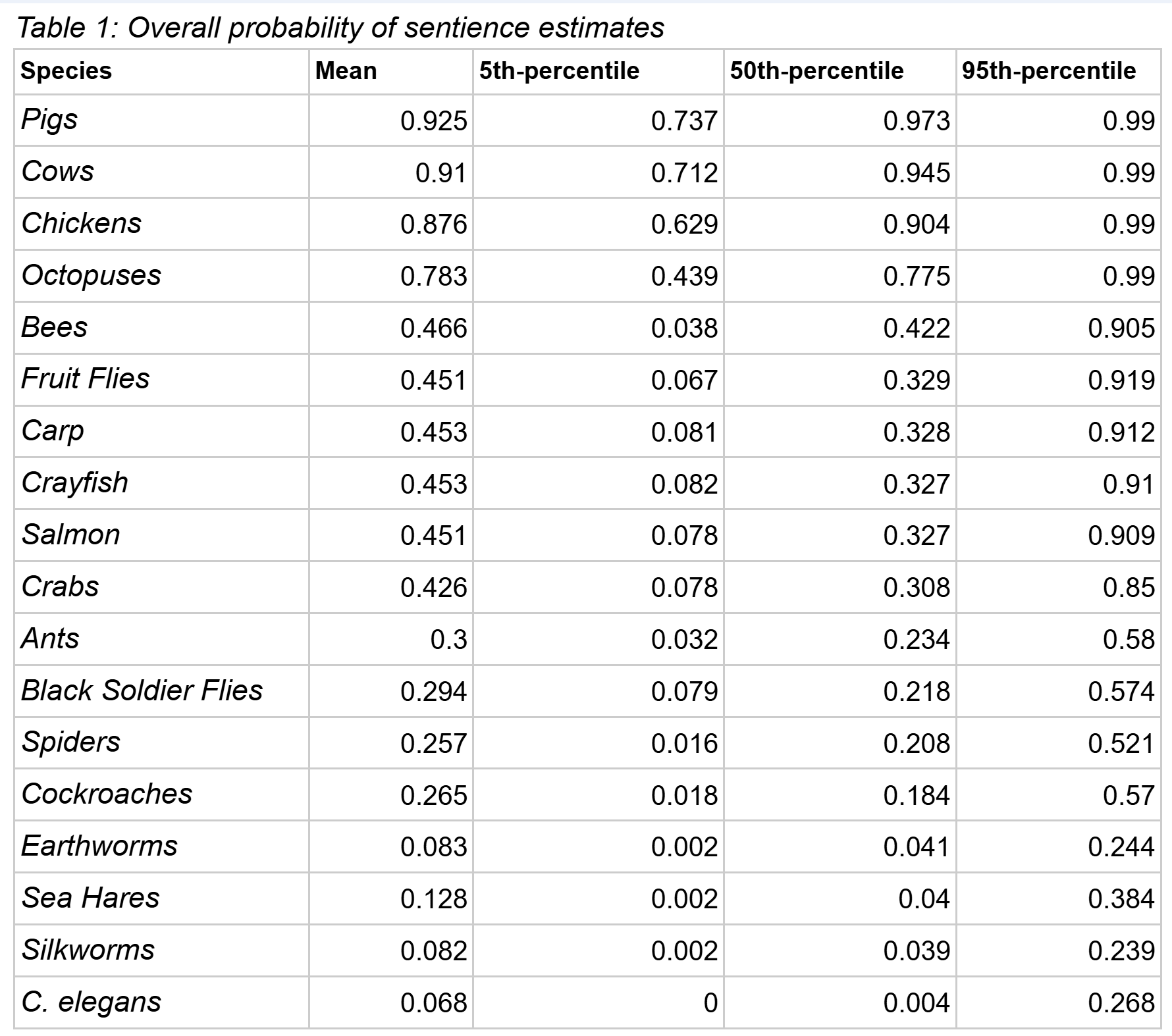 Jeff Sebo and Robert Long argue for extending moral consideration to AI systems if they have at least a 0.1 % chance of being conscious. By this criterion, moral consideration should also be extended to the 10^18 terrestrial arthropods, 10^20 marine arthropods, and 10^21 nematodes (numbers from Table S1 of Barn-On et al. (2018)), given Rethink Priorities' (RP's) estimates for the probability of sentience (see numbers at the bottom of the table below). Even for 10^3 sentient AI systems per human being, I would expect the vast majority of sentient beings to be arthropods and nematodes. There would be 8*10^12 (= 8*10^9*10^3) sentient AI sytems, 8.2*10^16 (= 0.082*10^18) and 8.2*10^18 (= 0.082*10^20) sentient terrestrial and marine arthropods in expectation, assuming a random arthropod is as likely to be sentient as a silkworm, and 6.8*10^19 (= 0.068*10^21) sentient nematodes in expectation. For most sentient beings to be digital in expectation, there would have to be way more than trillions of sentient digital minds.
