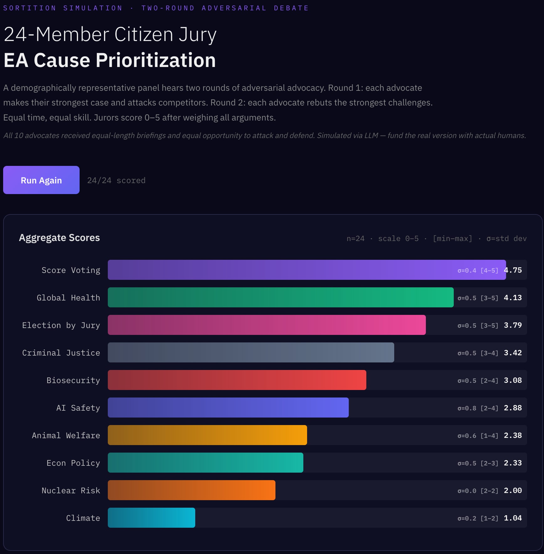 And here is where the argument becomes recursive: election by jury is itself a candidate cause area. I believe that if you actually ran this process — convened a representative, informed panel and asked them to evaluate EA cause areas including election by jury itself — the panel would rank democratic reform extremely highly. Because ordinary people, when deeply informed about how their governance systems work and how they could work, consistently recognize the magnitude of the dysfunction and the value of the fix.