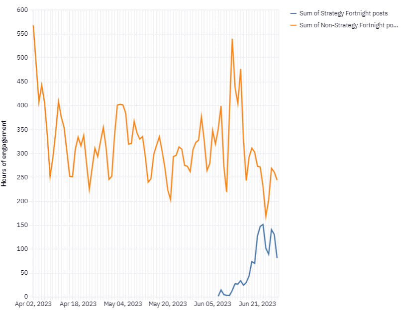 4. When doing a “special event” on the forum, I always wonder whether the event will add to the forum’s engagement or just cannibalize existing engagement. I think the strategy fortnight was mostly additive, although it’s pretty hard to know the counterfactual.