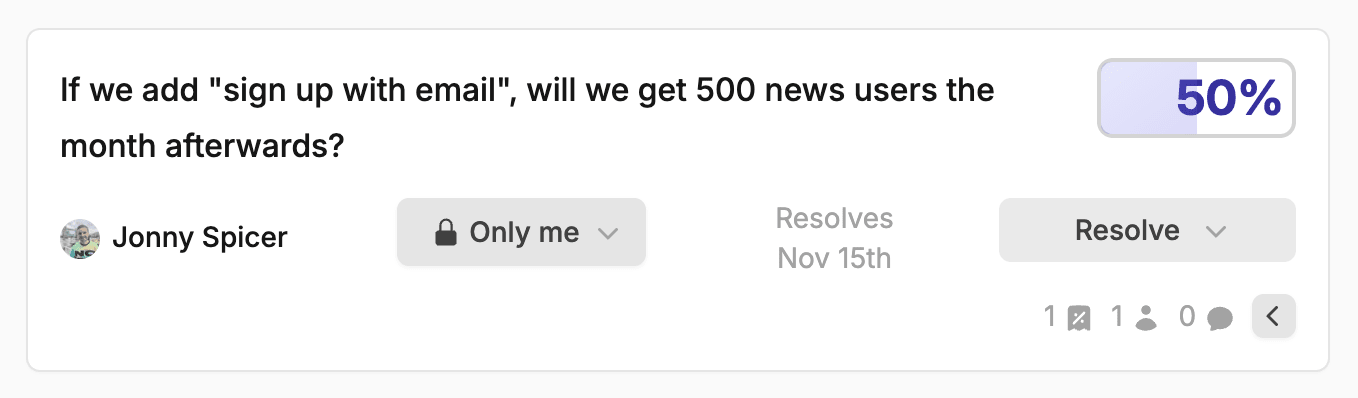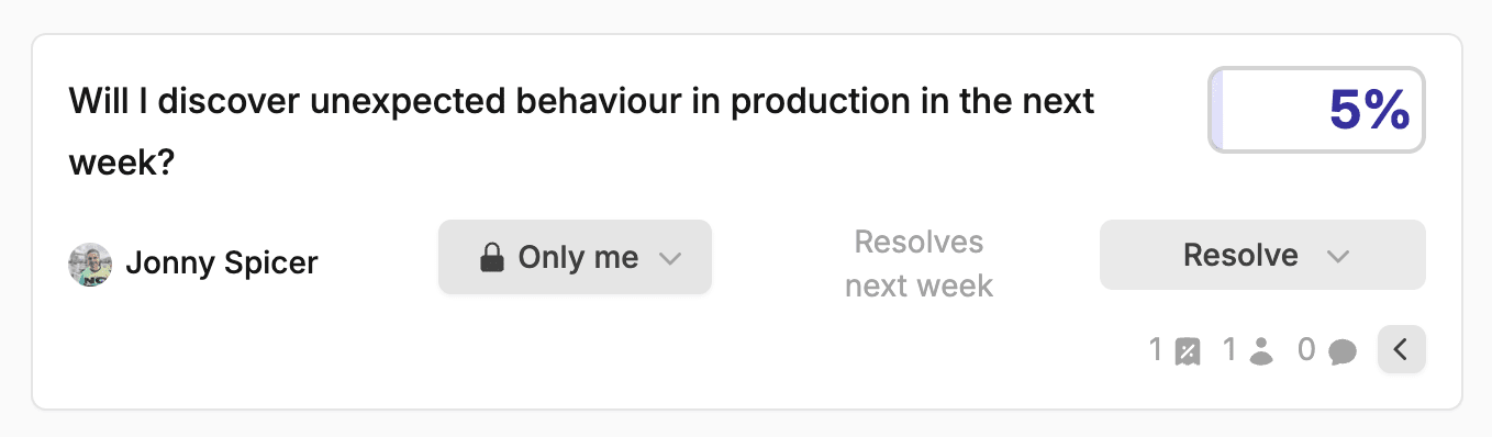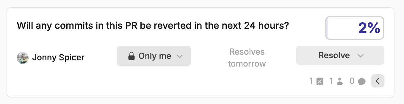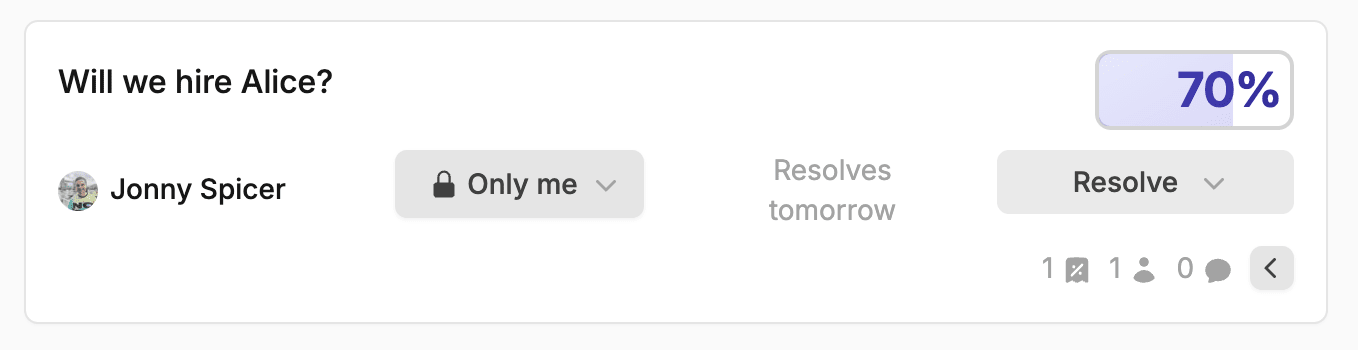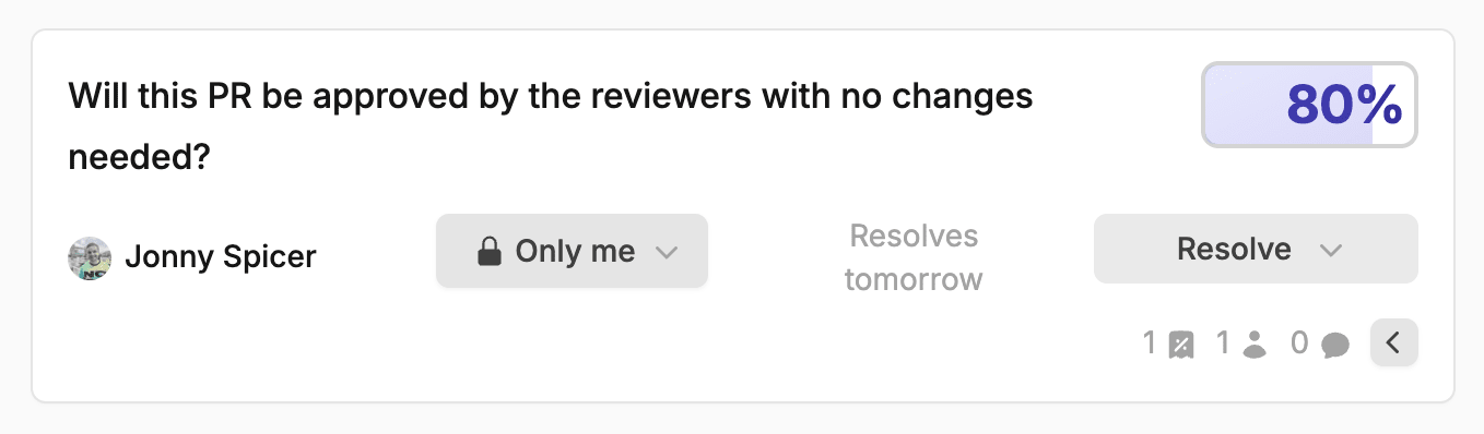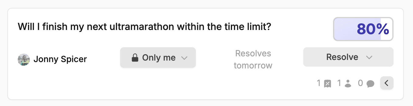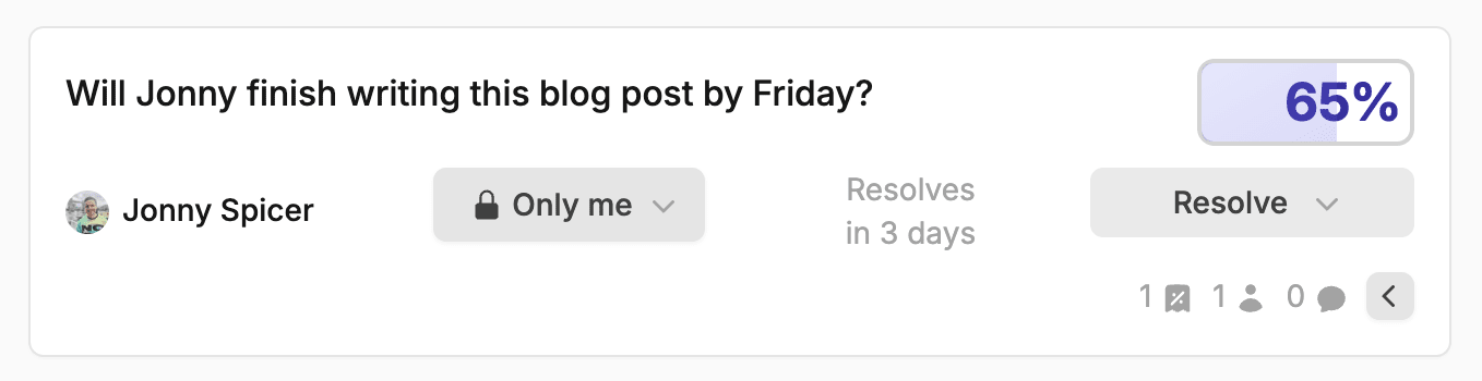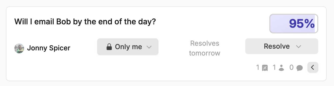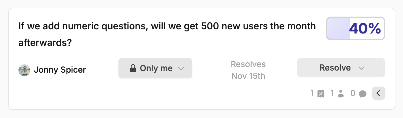 Practice and creativity have allowed me to get more value out of the questions I ask, and the predictions I make. For example, it has helped me communicate with my team better around project timelines, hiring decisions and strategy prioritization. We share predictions with one another using Fatebook for Slack on questions like: