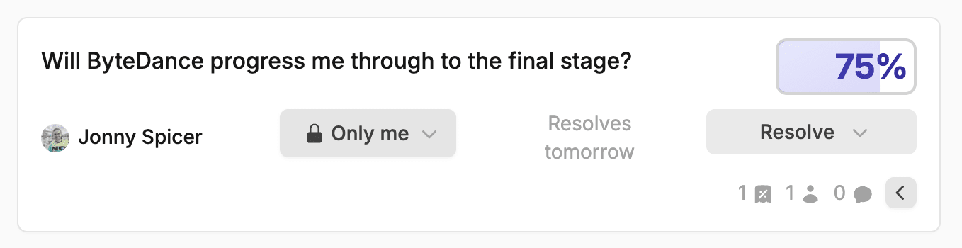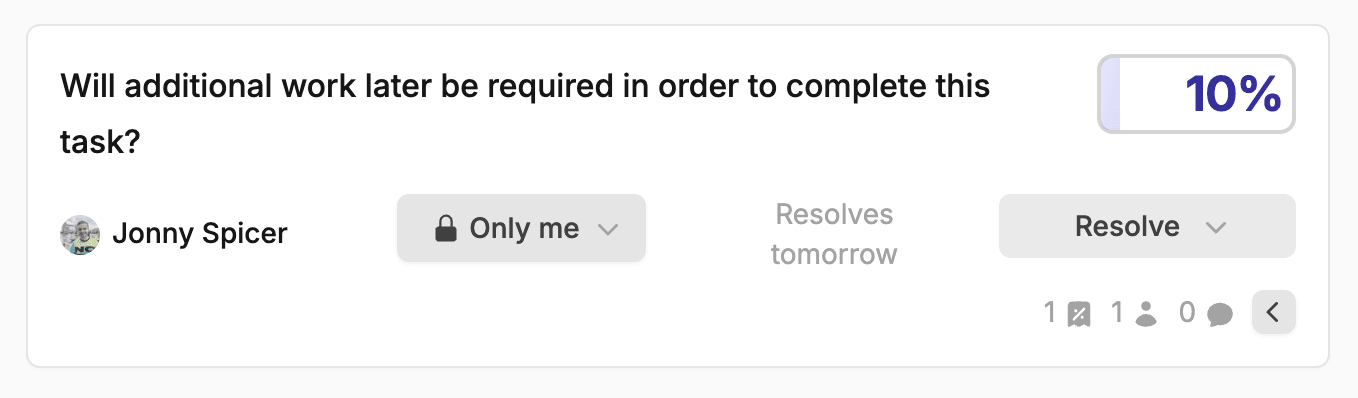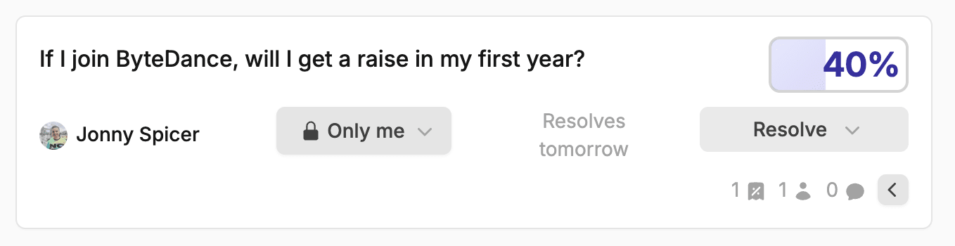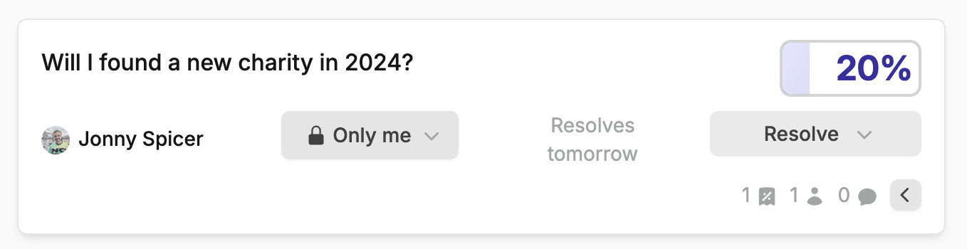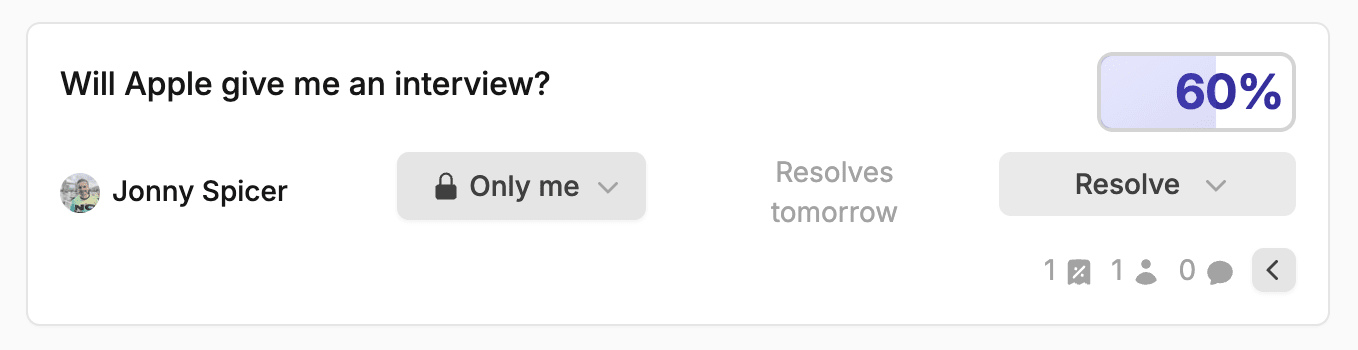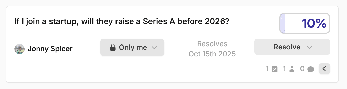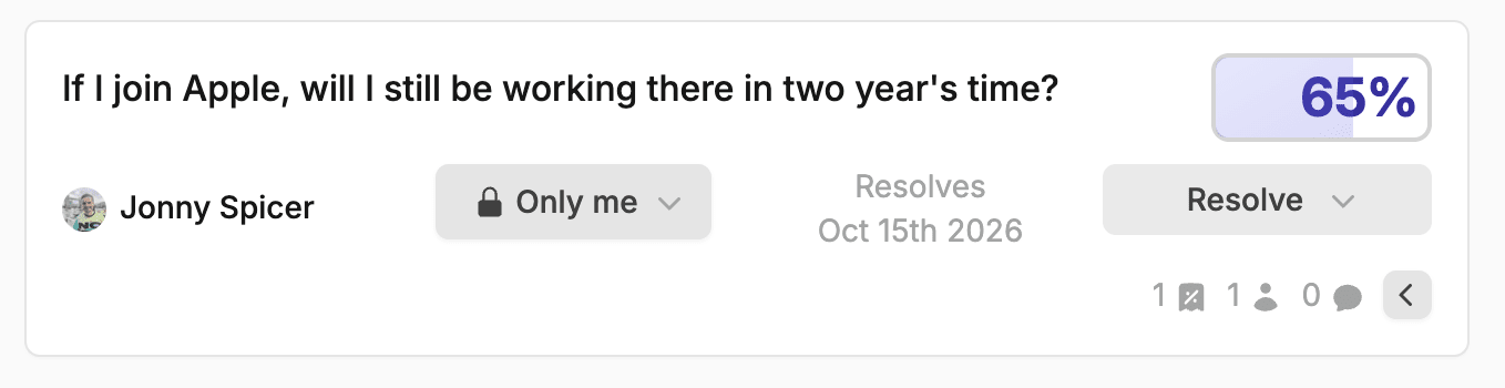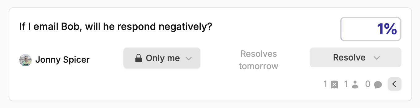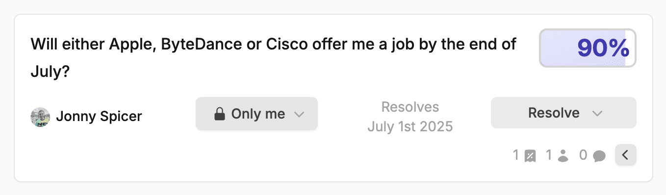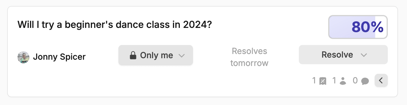 Practice and creativity have allowed me to get more value out of the questions I ask, and the predictions I make. For example, it has helped me communicate with my team better around project timelines, hiring decisions and strategy prioritization. We share predictions with one another using Fatebook for Slack on questions like:
