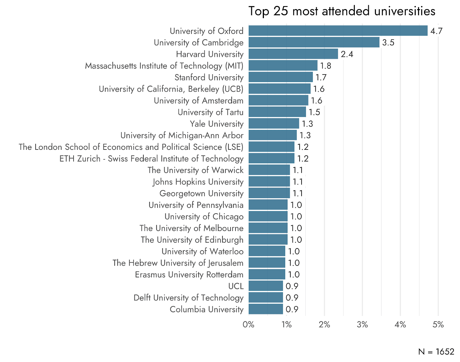 The University of Oxford was the most commonly reported university (4.7%), followed by the University of Cambridge (3.5%) and Harvard University (2.4%). All three are highly ranked universities, as are many of the other reported universities. This is likely at least partly due to higher outreach at these universities (see e.g., here, here, and here), as well as these universities being located in English-speaking countries.