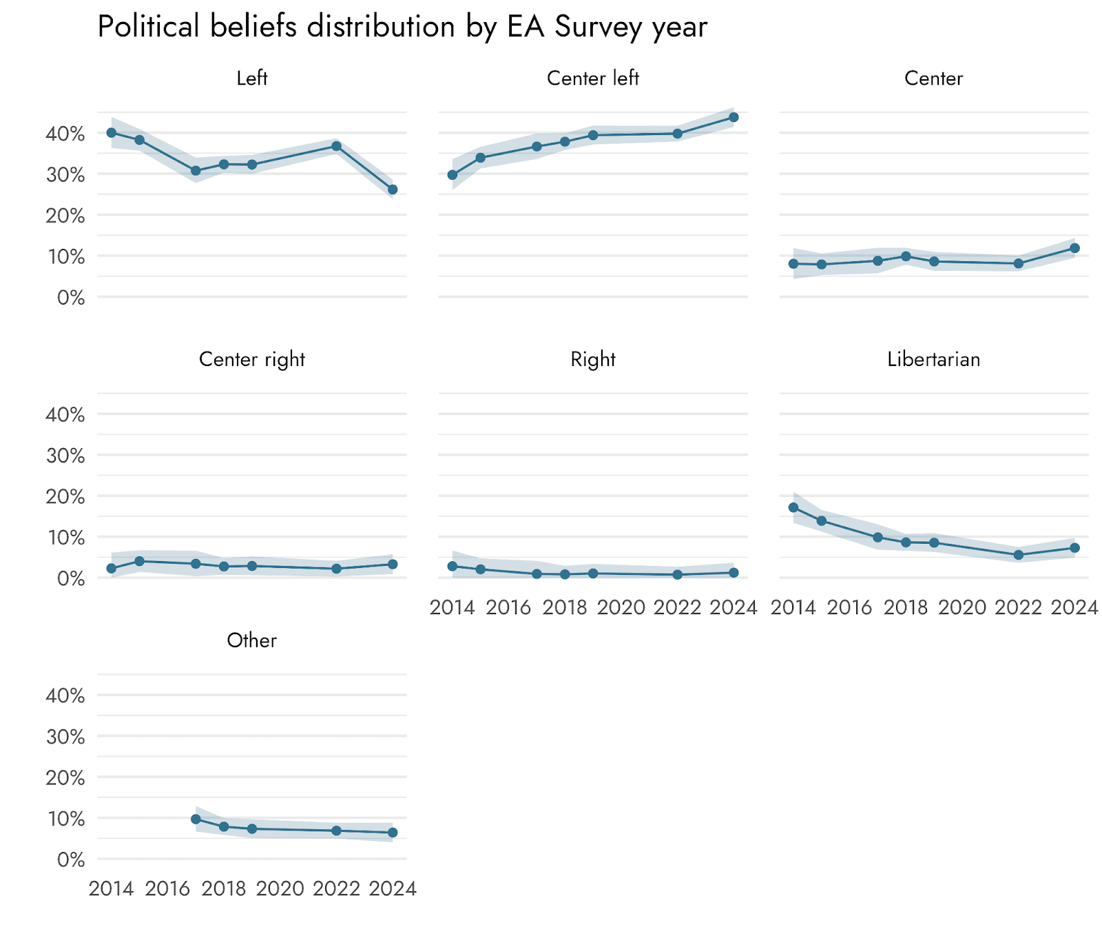 The political orientation question was included in the EA Survey since 2014 (but omitted in the 2020 survey), allowing us to see how the distribution has changed over the last decade. Notably, we see a reduction in the percentage of (fully) left-leaning respondents from 2022 to 2024. We also see that the percentage of center-left leaning respondents has steadily increased over the years, while the percentage of libertarian respondents has decreased compared to the earlier years (and has remained fairly constant over the last several years).
