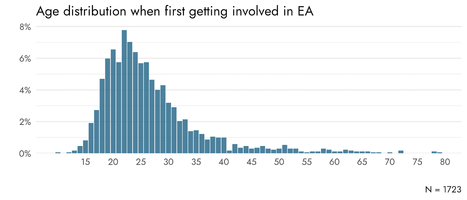 The average age of respondents when they first got involved in EA was (naturally) lower, with an average age of 26.7 and a median age of 24.