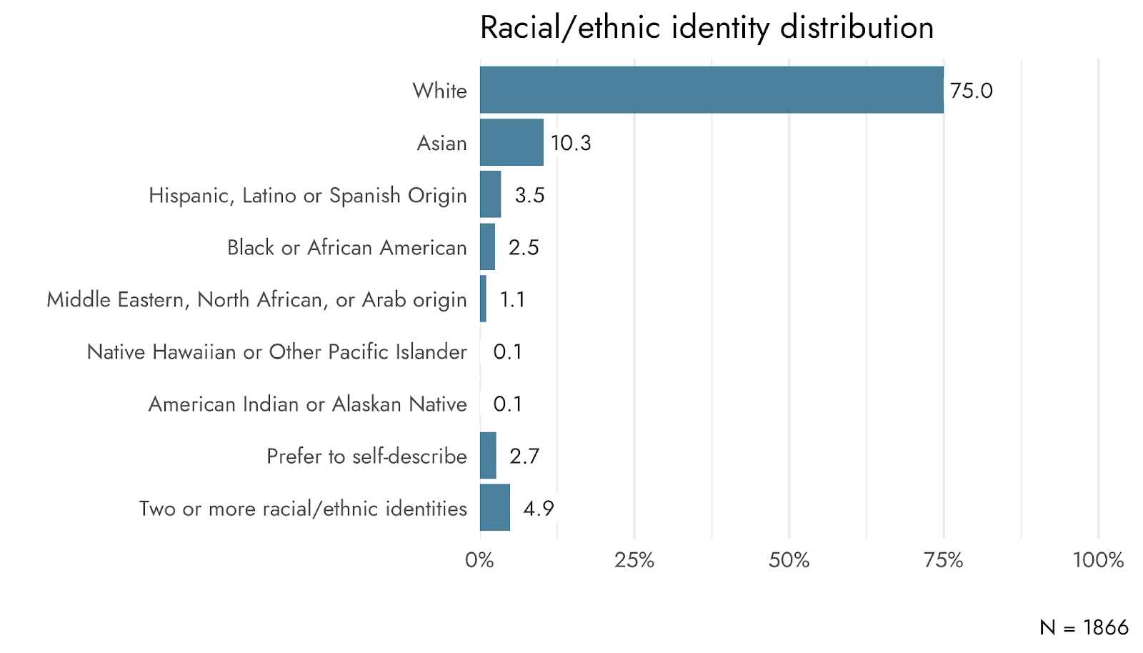 We again find that most respondents identify themselves as White (75%), followed by Asian (10.3%) and two or more racial/ethnic identities (4.9%).