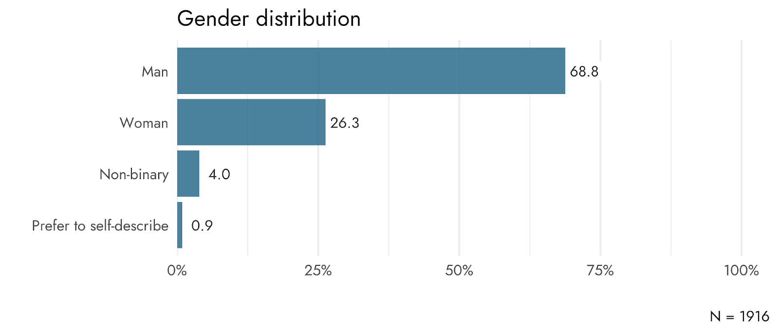 Last time we noted a small decrease in the percentage of men between 2022 and 2020 (from 70.5% to 66.2%). This time we see a small increase in the percentage of men compared to 2022 (from 66.2% to 68.8%) and a decrease in the percentage of women (from 29.3% to 26.3%). The percentage of non-binary and respondents who preferred to self-describe their gender stayed mostly the same (from 4.5% to 4.9%, see the group ‘Other’ in the graph below).