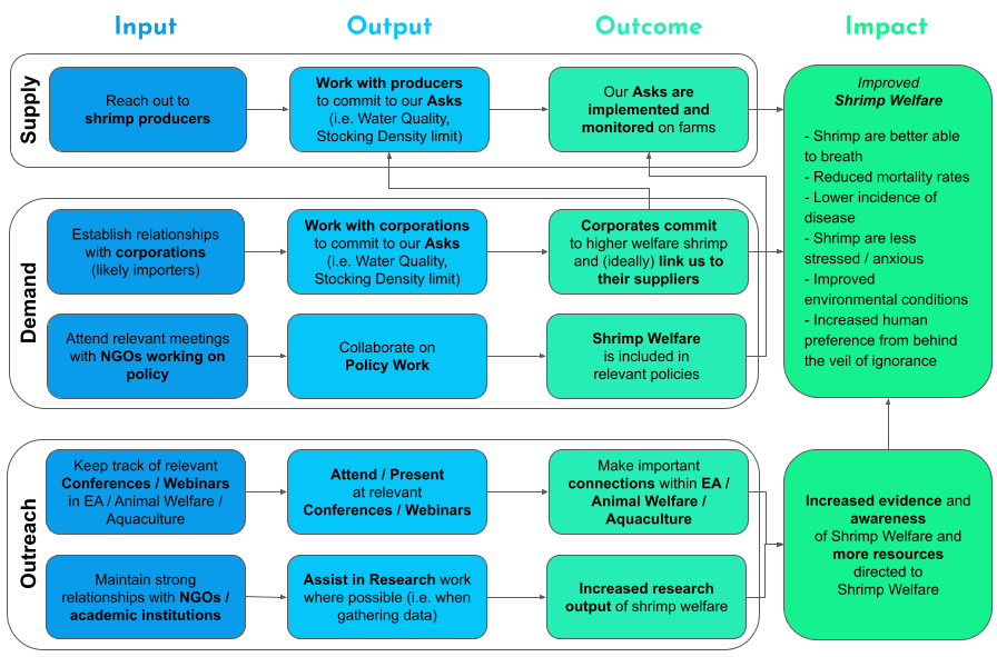 Advocacy: You're absolutely right, that's been our impressions of corporate advocacy work too and we're currently not expecting to drum up grassroots campaigns, or do any significant work on public awareness. Our expectation as it stands is that we can frame the benefits of shrimp welfare as a lever for sustainability. The Seafood Task Force has managed to make shrimp supply chain improvements driven by retail largely without the buy-in of consumers [1]. In addition, we hope to enable corporations to be leaders in this area, as consumer awareness of aquatic welfare increases (i.e. due to Seaspiracy etc.).