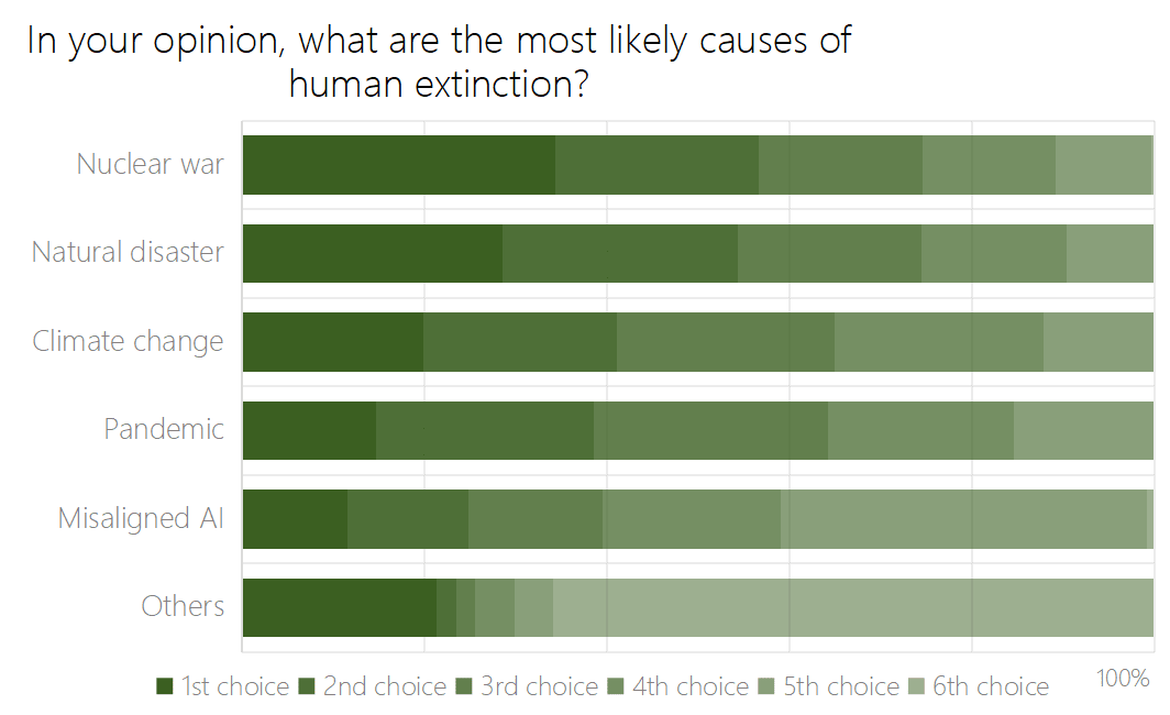 When asked about the most likely causes of human extinction, misaligned artificial intelligence received the lowest score. Nuclear war, natural disaster, climate change, and pandemics all proved more concerning for students.