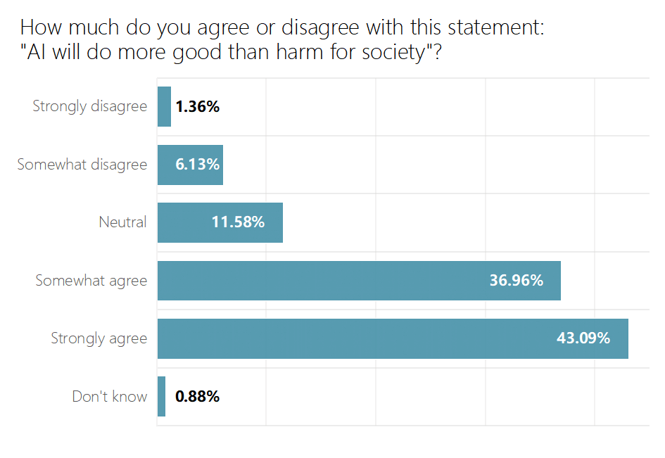 Respondents strongly believed that AI's benefits outweigh the risks. 80% of respondents agreed or strongly agreed with the statement that AI will be more beneficial than harmful for society. Only 7.49% actively believed the harms could outweigh the benefits, while 12.46% remained neutral or uncertain.