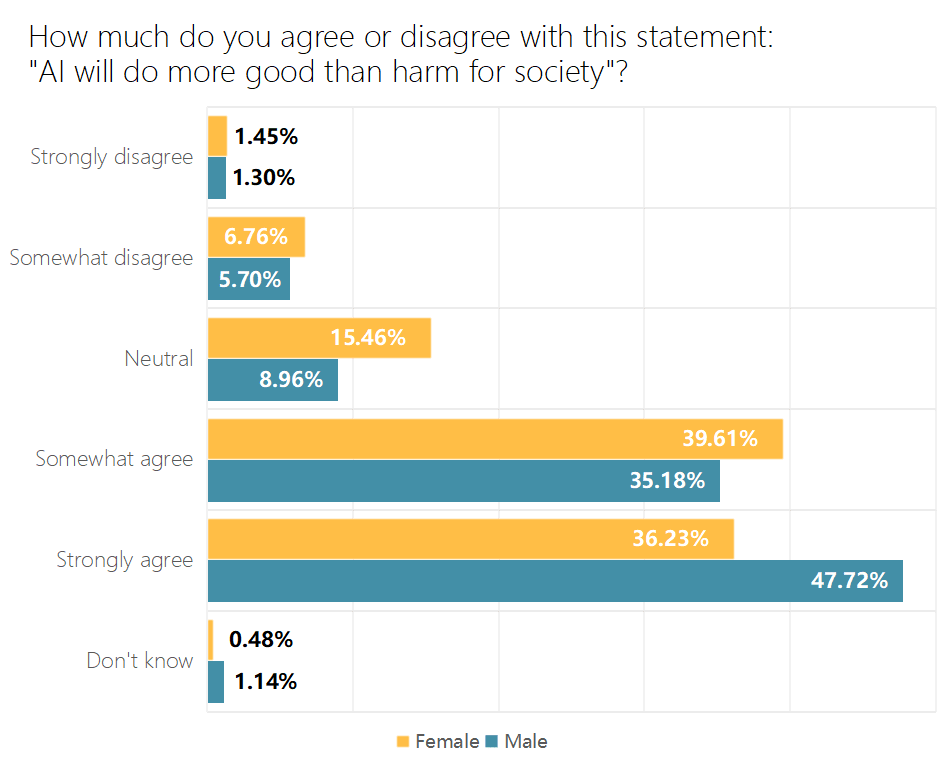 Women tend to be less optimistic about AI than men. Our study revealed a similar gender divide in attitudes towards AI, with male-identifying students displaying slightly greater optimism about its societal impact compared to their female-identifying counterparts. While 82.9% of males somewhat or strongly agreed that AI will do more good than harm for society, only 75.8% of females shared this positive outlook.