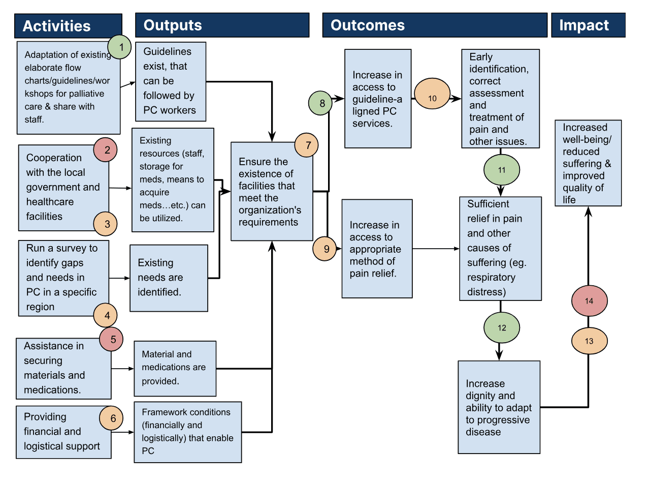 We expect there to be a broad variety of reasons why the named activities in our causal change do not necessarily lead to the establishment of well-equipped settings for palliative care in 100% of the cases (among others e.g. the density and quality of existing healthcare and the availability of medical personnel in the country where we want to operate).