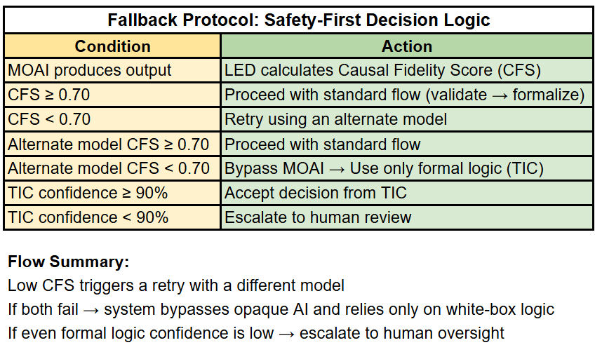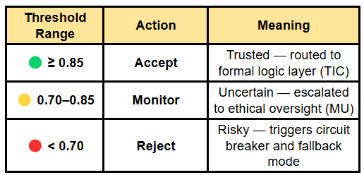 - Final safety check: If the formal logic layer (TIC) shows low confidence and the ethical layer (MU) detects high risk, → The system automatically escalates to human review.