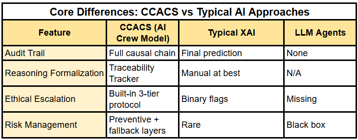 This modular setup also means that any single crew can be retrained, updated, or replaced without rebuilding the entire system - making the architecture adaptive by design, not just configurable. Instead of one big brain, ACCCU builds a thinking institution - where every insight is vetted, explained, and governed across domains.