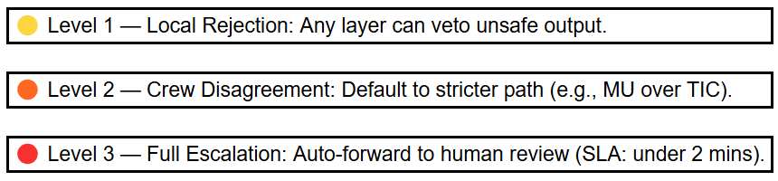 For example, if two crews disagree (say, one recommends action and another flags risk) the 3-Tier Override Protocol resolves it by prioritizing safety, defaulting to human oversight if needed.