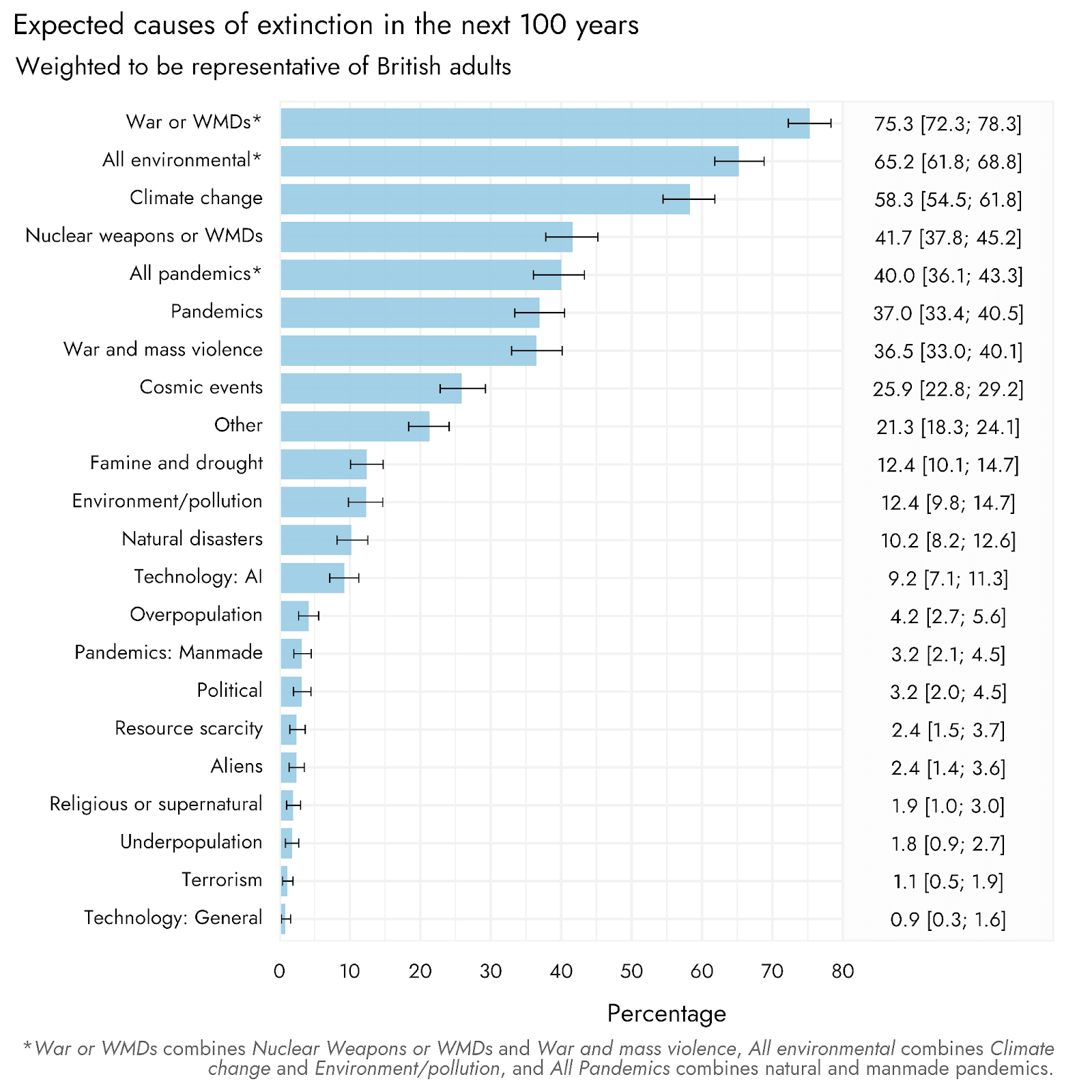 - We surveyed UK respondents, asking them to list (without prompting) the three factors they thought most likely to cause human extinction in the next 100 years.