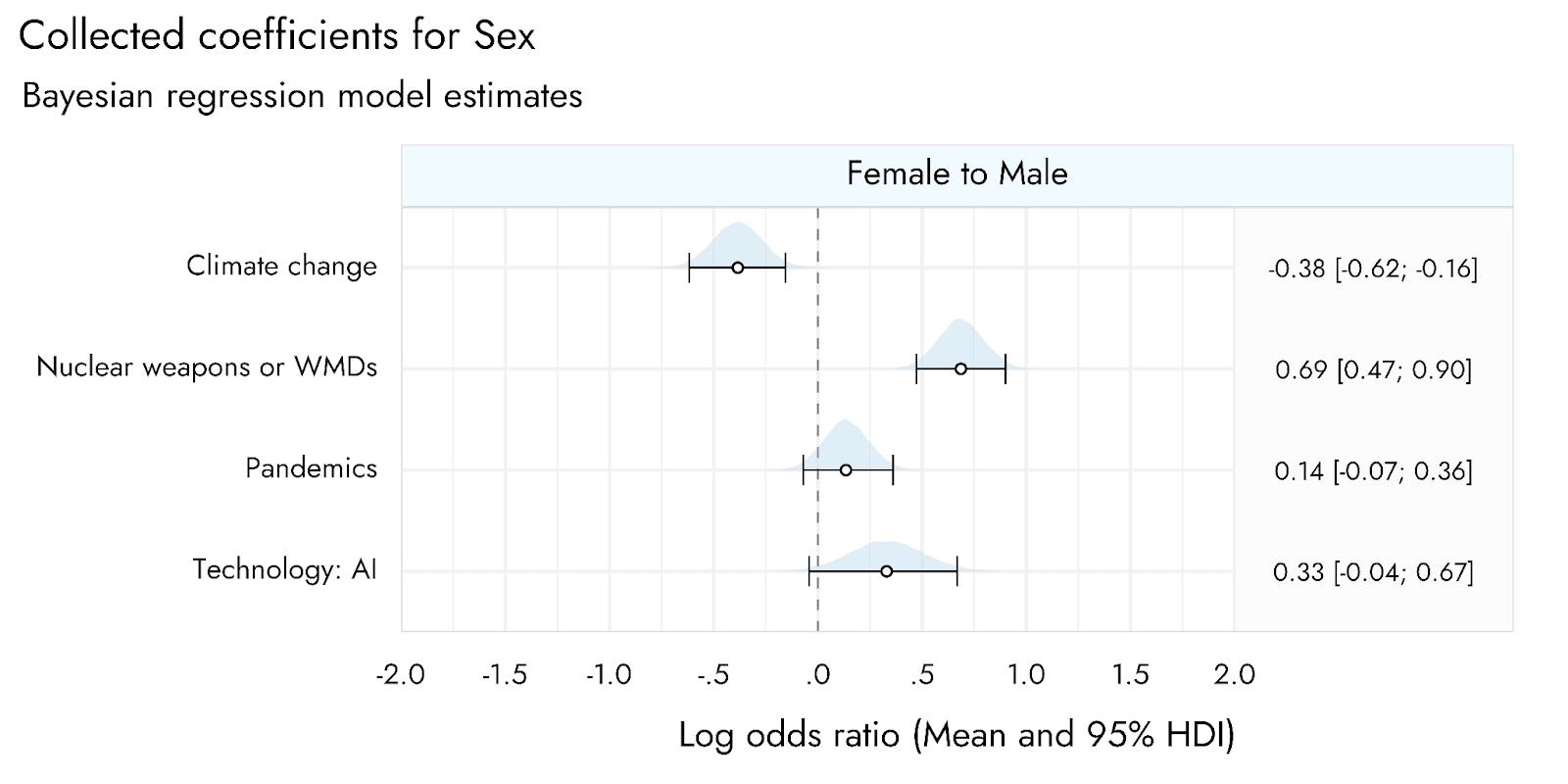 With respect to sex, relative to female respondents, we found that male respondents were reliably more likely to mention Nuclear Weapons/WMDs, and less likely to report Climate change, as causes of extinction (Figure 3). There was also a tendency for male respondents to mention AI more, although the coefficient for this estimate indicates that negligible or no differences between male and female respondents were well within the realm of possibility.