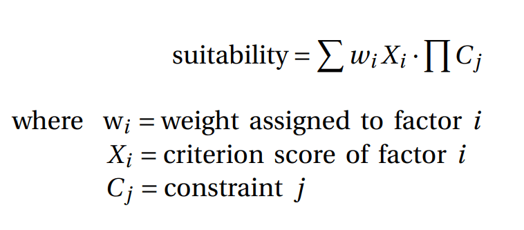 Multiplying the Boolean value by the suitability index ensures that suitable locations remain unchanged, while unsuitable ones are set to 0. This is illustrated in the provided formula, where the sum of the weight multiplied by the standardised score is further multiplied by the Boolean constraint, resulting in the final suitability index.