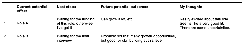 Then he gave me a template for comparing different roles and we discussed each of them and how I felt about them. Role A was AAC and role B was another charity.