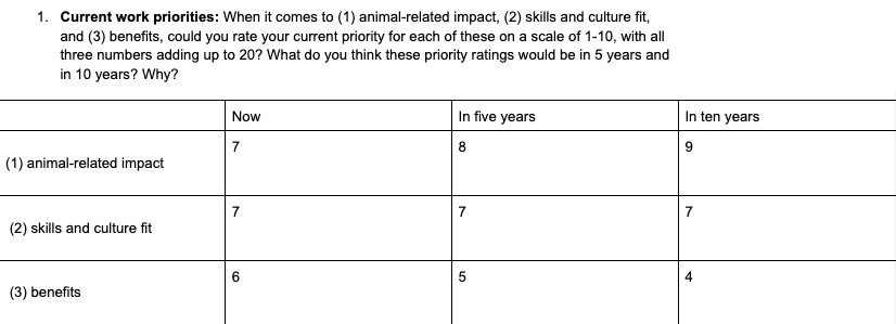 My mentor helped me prioritize career values and compare options using a structured template. First, he asked me to come up with my life priorities - see the actual table below (each time-related column could only contain 20 points).