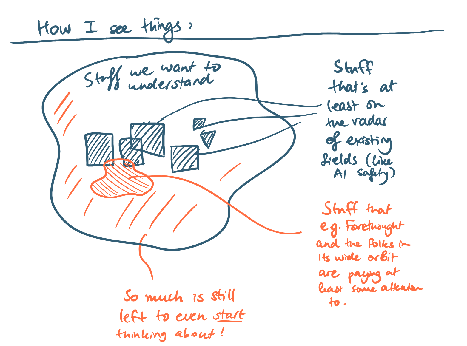 So in my view Forethought is helping to fill a very important gap in the space.[3] But Forethought is pretty tiny,[4] and collectively my sense is we’re nowhere near on track for understanding things to a degree that would make me happy. I think we don’t even have a bunch of the relevant questions/issues/dynamics on our radar at this point.