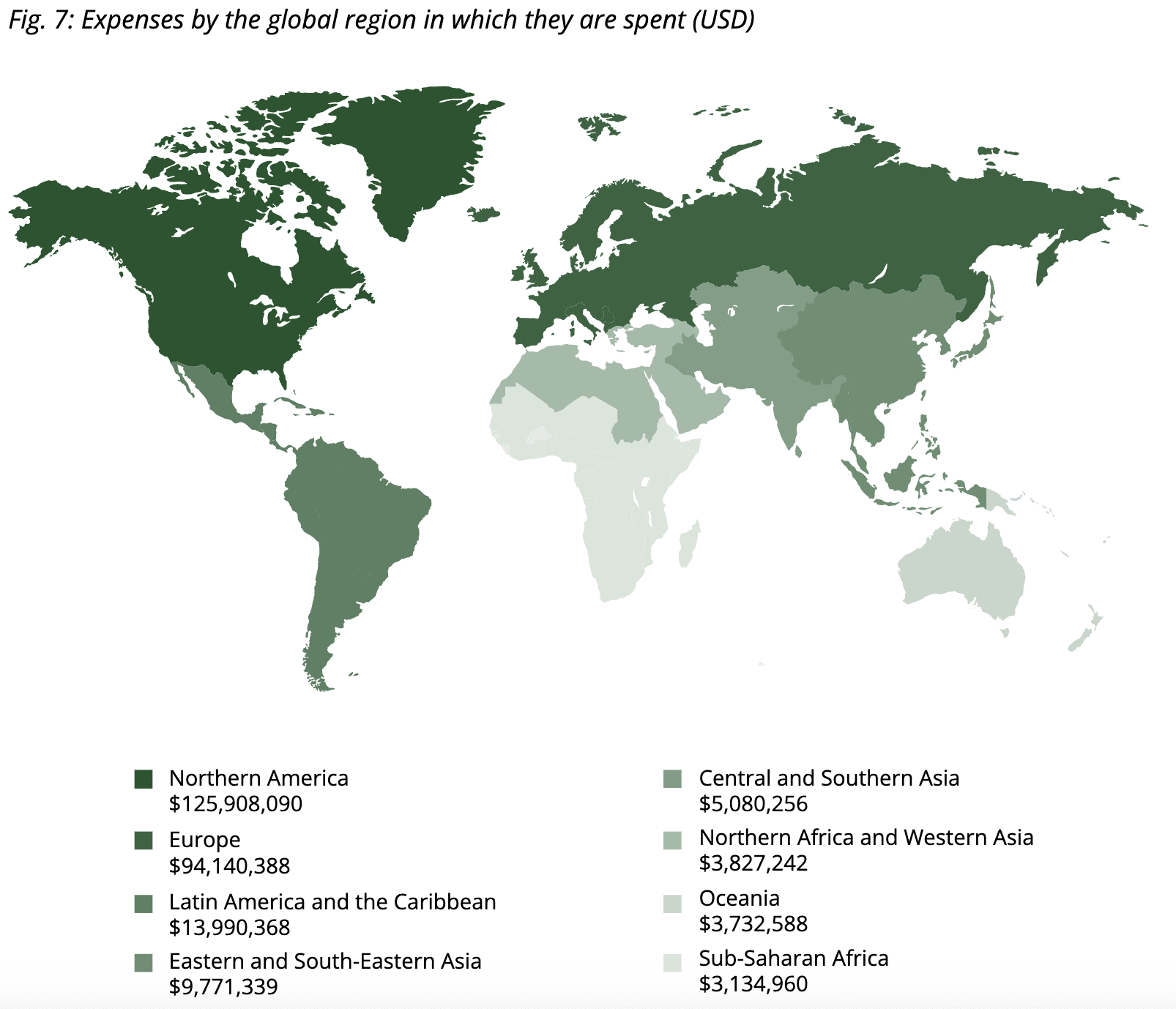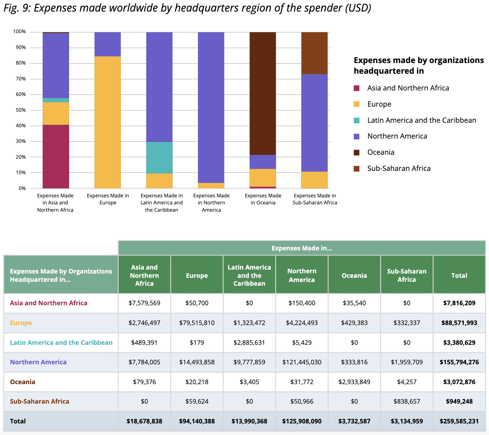 North American and European orgs accounted for most of the spend in sub-Saharan Africa and LATAM & the Caribbean, despite spending (say) only ~1% of their total expenses in SSA: