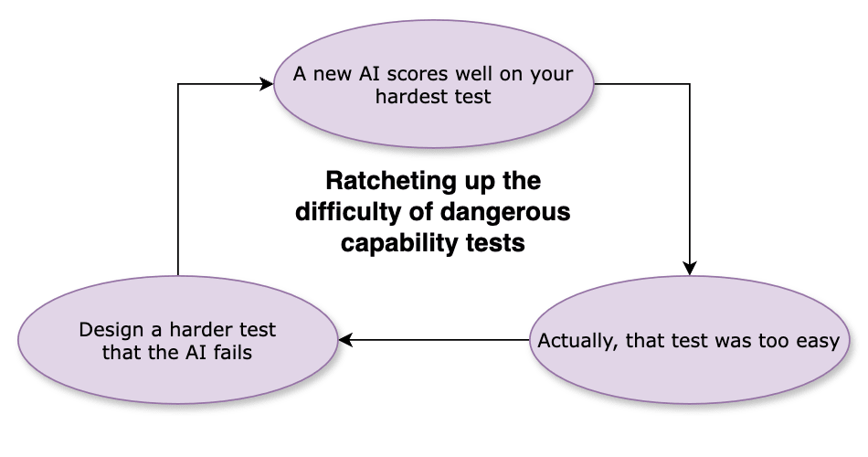 All these tests have a weird one-directionality to them: If an AI fails, it’s probably safe; but if it succeeds, it’s still not clear whether it’s actually dangerous. As newer models pass the older easy dangerous capability tests, companies ratchet up the difficulty, making these tests gradually harder over time: