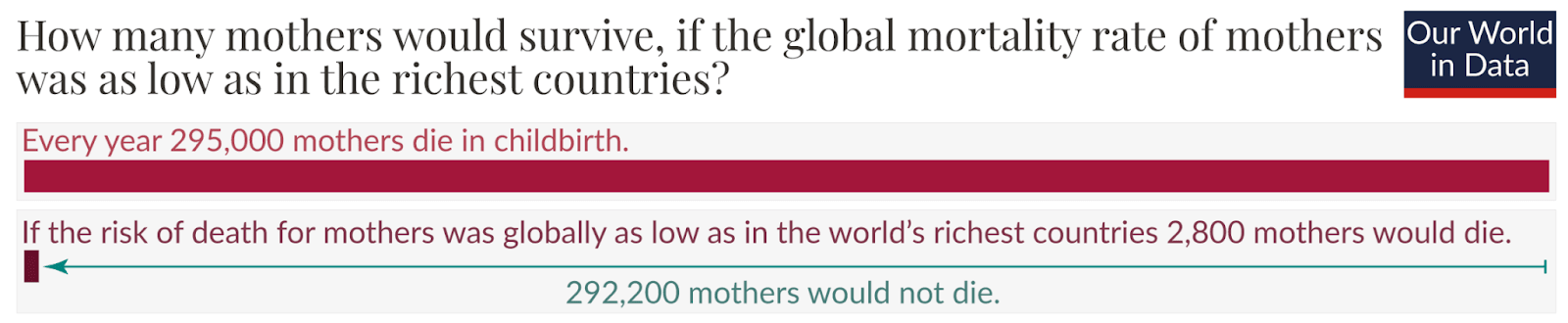 Per fare un esempio concreto, consideriamo la mortalità materna. Nei paesi ad alto reddito, dove le partorienti possono contare su ospedali ben equipaggiati e sul supporto di dottori e ostetriche in caso di complicazioni, le morti per parto sono diventate rare (il rischio di morte di parto è diminuito di 300 volte nelle ultime generazioni). Ma nel resto del mondo sono ancora molto comuni: ogni anno 295000 madri muoiono durante il parto.