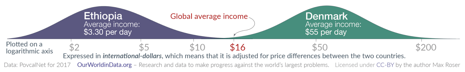 All’altro estremo, possiamo immaginare un mondo con diseguaglianze economiche estreme, come le attuali disuguaglianze tra un paese povero e uno ricco. In questo caso, il posto in cui una persona vive determina tutto. I dati per Etiopia e Danimarca mostrati qui sotto lo rendono evidente: le due distribuzioni in pratica non si sovrappongono, ed è quasi certo che una persona nata in Danimarca abbia un reddito superiore alla media mondiale, e che invece una persona nata in Etiopia abbia un reddito inferiore alla media mondiale.