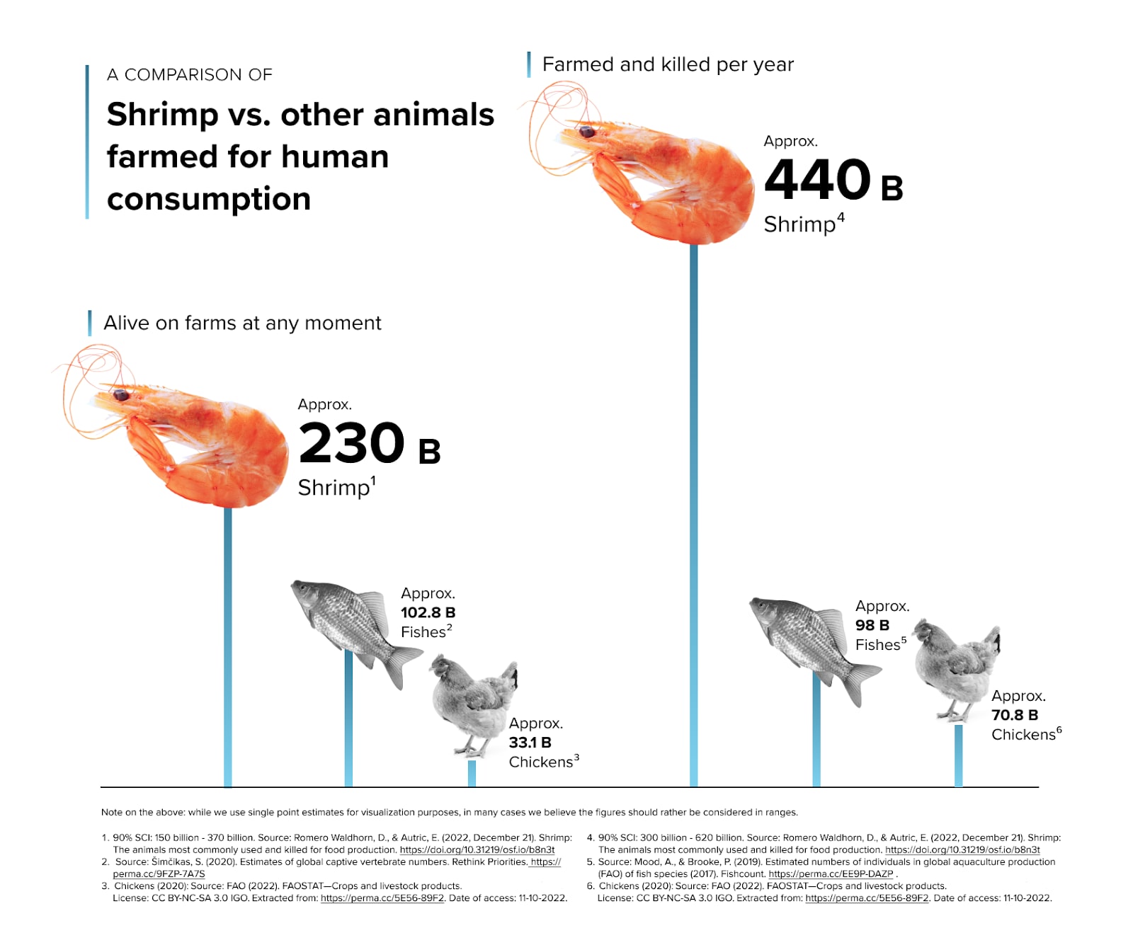 The number of individuals affected by shrimp production is a key metric for the seriousness of potential welfare problems (Birch, 2017 p. 4). Hence, our first report estimated how many shrimp are used for food each year. By converting data on the biomass of animals slaughtered each year to numbers of individuals, we find that wild-caught shrimp represent the majority of animals directly killed for food each year (~25 trillion). Meanwhile, we find that there are more shrimp alive on farms at any time than any other type of animal (~230 billion).