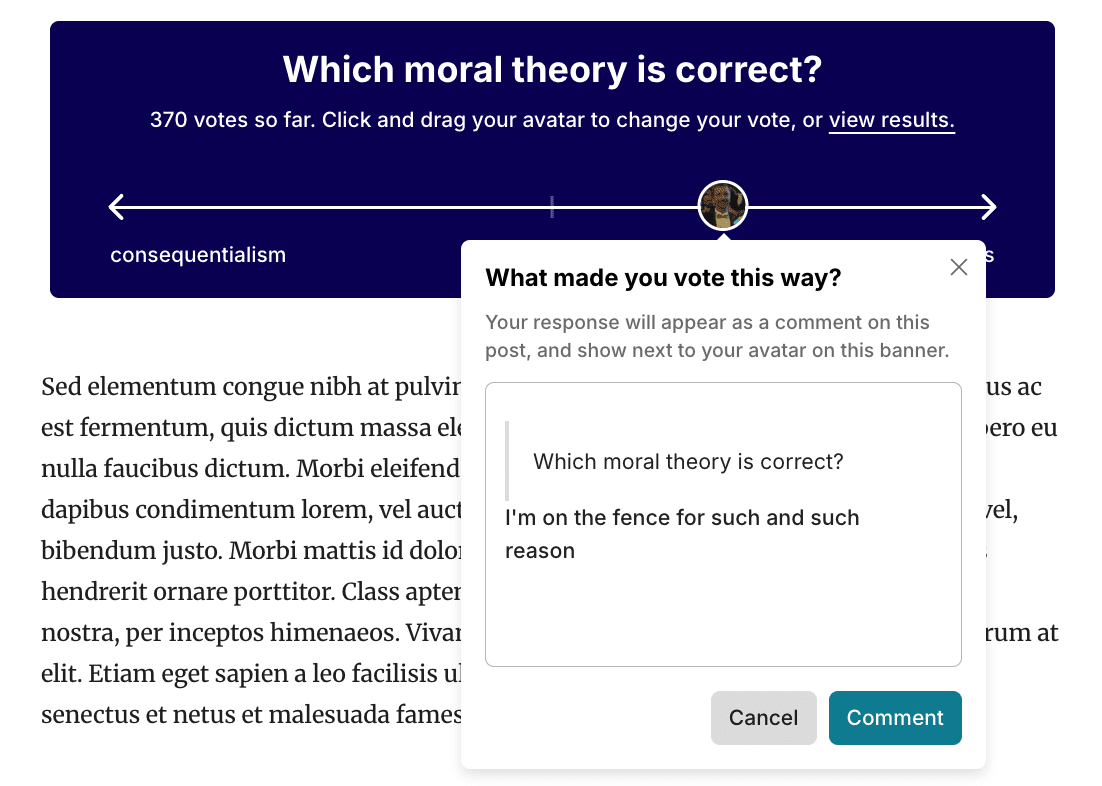 So that readers can contextualise your comment, a percentage will appear on the comment to indicate the strength of your vote, and whether you have changed your mind since your first vote. To avoid confusion on posts with multiple polls, the title of the poll will be quoted at the top of your comment.