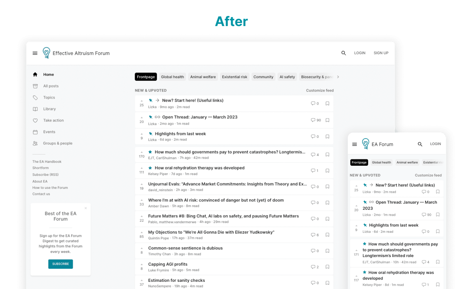 This post was mostly written by Lizka (and then reviewed by others on the team), but most of the work was not done by me! Agnes is the Forum's designer, and a lot of the people on the team worked on the changes we're talking about. Thanks to @Clifford for work on the Community section, to @Sharang Phadke for work on the redesign, and @Ollie Etherington and @Sarah Cheng for implementing the UI .